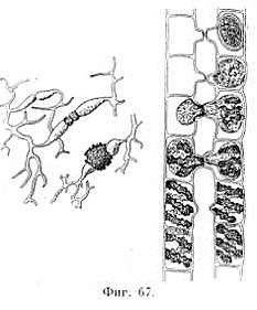 Вот микроскопическая водоросль, уже нам знакомая спирогира, с её характеристическими спиральными лентами хлорофилла. В известный момент развития этого организма составляющие его нити принимают параллельное положение, как это видно на рисунке. В некоторых клетках содержимое собирается в круглые или овальные клубки, и в то же время на двух смежных клеточках образуются вздутия стенки. Эти бугорки растут навстречу, сталкиваются, разделяющая их перегородка всасывается, исчезает, и тогда содержимое двух клеточек сливается в одну массу, причем совершенно безразлично, перельется ли содержимое из левой нити в правую или наоборот. Образовавшаяся таким образом округлая масса получает оболочку и превращается в спору, которая, освободившись, может прорасти и дать начало новому организму, новой нити спирогиры. Здесь мы, следовательно, встречаем процесс оплодотворения в крайне простой форме: две клеточки сливаются, чтобы дать начало одной, которая и служит для воспроизведения организма[2].