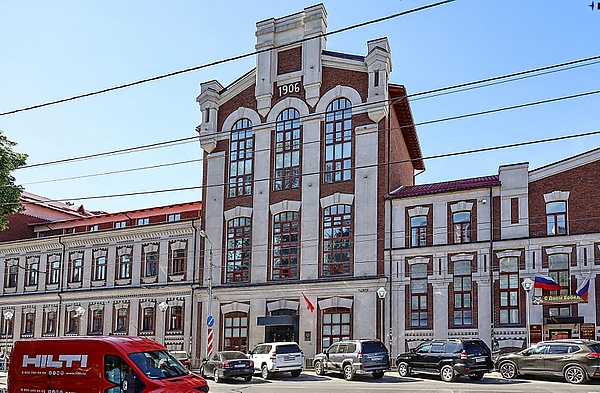В боковых двухэтажных крыльях фасада лучковые оконные проёмы декорированы наличниками с замковыми камнями и подоконными лопатками сложной формы. Элементы декоры выполнены кирпичной кладкой с применением профилированного кирпича. Вертикальный ритм фасаду задают лопатки, поддерживающий вынос широкого венчающего карниза с поясом сухариков. Трёхчастное членение фасада по горизонтали выполнено 2 развитыми профилированными широкими карнизными поясами с рядами поребриков над первым и вторым этажами и поясом кирпичным декором в виде сухариков под окнами первого этажа[2].