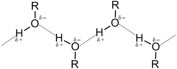 Высокие температуры кипения спиртов объясняются наличием межмолекулярных водородных связей[55]. Энергия водородной связи значительно ниже, чем энергия ковалентной химической связи. Так, например, для метанола энергия водородной связи составляет 16,7 кДж/моль[58] , тогда как связи C−H, C−O и O−H имеют энергию 391,7, 383,5 и 428,8 кДж/моль соответственно[59]. Тем не менее, влияние водородных связей на физические свойства спиртов весьма значительное.