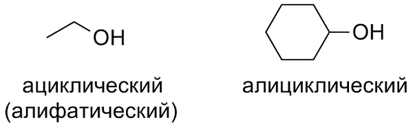 - В зависимости от наличия или отсутствия цикла в углеводородном заместителе: