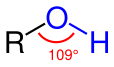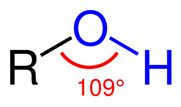 Молекулы спиртов, подобно молекуле воды, имеют угловое строение. Угол R−O−H в молекуле метанола равен 108,5°[55]. Атом кислорода гидроксильной группы находится в состоянии sp³-гибридизации. Спирты имеют существенно более высокие температуры плавления и кипения, чем можно было бы предполагать на основании физических свойств родственных соединений. Так, из ряда монозамещённых производных метана, метанол имеет необычно высокую температуру кипения, несмотря на относительно небольшую молекулярную массу[56]: