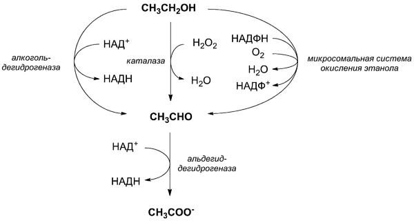 Среди низших спиртов с точки зрения физиологии наибольший интерес представляет, несомненно, этанол. В организме человека этанол является естественным метаболитом и в норме присутствует в крови в очень низких концентрациях. Также этанол может поступать в организм с пищей. Этанол в организме человека метаболизируется преимущественно в печени. Под действием цитозольного фермента алкогольдегидрогеназы этанол окисляется в ацетальдегид, который далее перерабатывается митохондриальной альдегиддегидрогеназой в ацетат. Ацетат после активации короткоцепочечной ацил-коэнзим А-синтетазой может далее разрушаться в цикле Кребса[46]. В утилизации этанола второстепенную роль играет также микросомальная этанол-окисляющая система, представленная цитохромом P450 и каталазой[40]. При высокой концентрации алкоголя в крови ферменты не справляются с оксилением ацетальдегида до ацетата, и в организме происходит накопление ацетальдегида, который в 10—30 раз токсичнее этанола[47], за счёт чего происходит отравление организма, т. н. похмелье. По энергетической ценности для организма этанол (7 ккал/г) занимает промежуточное положение между углеводами (4,1 ккал/г) и жирами (9,3 ккал/г). Вклад этанола в общую калорийность пищи у не страдающих алкоголизмом взрослых людей может достигать 12 %. Однако потребление этанола в качестве пищевого продукта и источника энергии имеет ряд недостатков с биохимической точки зрения. Кроме образования токсичного ацетальдегида, к таким недостаткам следует причислить тот факт, что избыточные калории, поступившие в организм в форме этанола, могут запасаться только в жирах, так как возможность преобразования этанола в углеводы в организме человека отсутствует[46]. Кроме того, этанол нарушает другие метаболические процессы: ингибирует глюконеогенез (это является причиной гипогликемии при приёме больших доз алкоголя), ускоряет производство цитокинов, изменяет концентрацию гормонов[48]. Алкогольные напитки содержат очень мало витаминов и минеральных веществ, что также может оказать негативное влияние на здоровье. Также пищевой этанол сам по себе намного дороже, чем энергетически эквивалентное количество сахара[46].