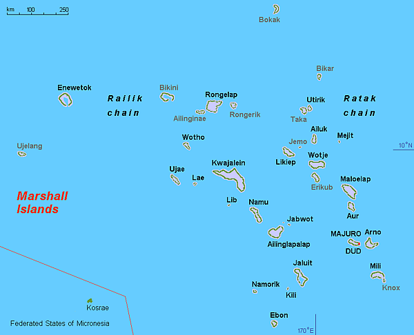 Республика Маршалловы Острова состоит из 29 низменных атоллов, каждый из которых включает множество островков, и 5 островов. Все они расположены в Тихом океане, могут быть поделены на две цепи островов — Ралик и Ратак. Общая площадь суши составляет 70,1 кв.миль (181,42 км²). Численность населения — 53 158 человек (2011).