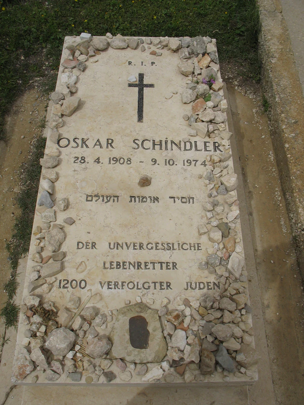 Процессия из евреев, спасённых Шиндлером, их потомков, актёров, участвовавших в фильме, проходит возле могилы Шиндлера в Израиле. В знак уважения каждый кладёт камень на могильную плиту. В последней сцене фильма на могилу Шиндлера кладёт цветы человек, лица которого не видно. Это исполнитель роли самого Шиндлера Лиам Нисон.