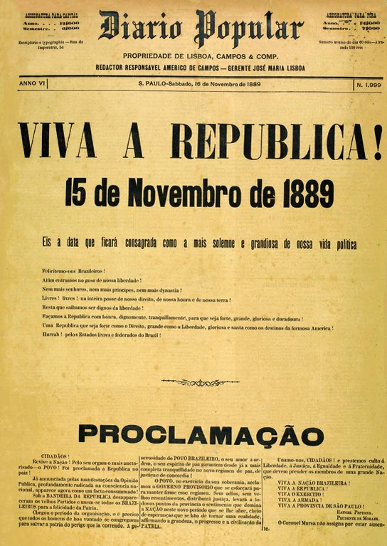 Первая Бразильская республика была установлена 15 ноября 1889 года в результате военно-политического переворота, организованного маршалом Деодору да Фонсекой, провозгласившим Республику Соединённых Штатов Бразилии (порт. República dos Estados Unidos do Brasil)[4] на поле Сантана в Рио-де-Жанейро (где в 1822 году прошла инаугурация первого императора)[18] и ставшим главой временного правительства[47]. Начавшаяся сразу разработка республиканской конституции завершилась её утверждением 24 февраля 1891 года[60]. На прошедших на следующий день в Национальном конгрессе президентских выборах Фонсека победил как независимый кандидат, однако в том же году был вынужден подать в отставку и передать полномочия вице-президенту Флориану Пейшоту.
