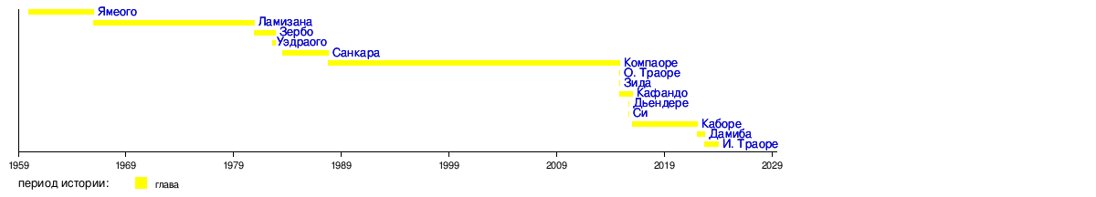 11 декабря 1959 | 5 августа 1960 | Вольтийский демократический союз — Африканское демократическое собрание | Президентские выборы в Верхней Вольте (1959) | [6][7] | |