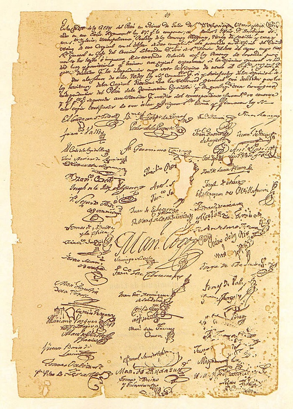 8 сентября 1820 года армия освободительной экспедиции в Перу под командованием Хосе де Сан-Мартина высадилась на побережье у города Писко.[9] После занятия Лимы Сан-Мартин предложил его жителям дать клятву делу независимости. 15 июля 1821 года муниципальный совет Лимы принял декларацию о независимости, написанную Мануэлем Пересом де Туделой, публичное оглашение которой состоялось 28 июля 1821 года на главной городской площади[10].