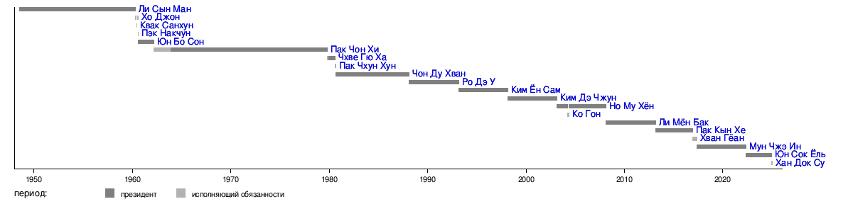 - ↑ Как премьер-министр страны исполняет обязанности президента после объявления парламентом 14 декабря 2024 года импичмента президенту Юн Сок Ёлю.