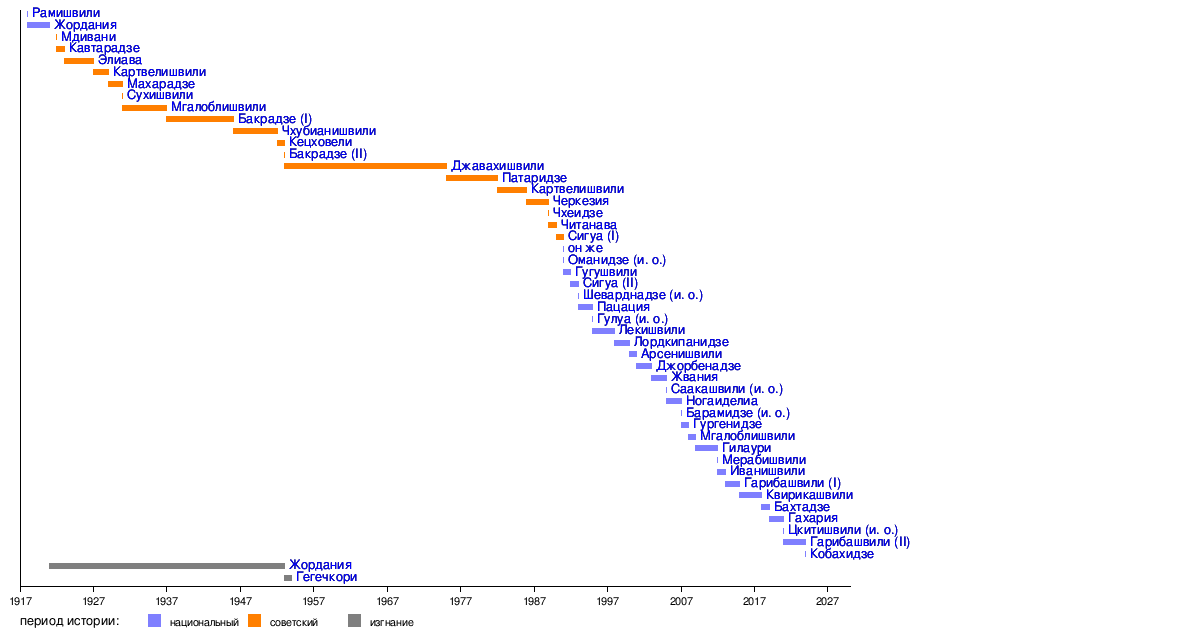 18 марта 1921 | 11 января 1953 | Социал-демократическая партия Грузии | глава Национального правительства Грузии груз. საქართველოს ეროვნული მთავრობის მეთაური |