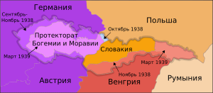 После подписания 30 сентября 1938 года Мюнхенского соглашения (без участия представителей Чехословакии) Германия присоединила к себе Судетскую область[8], затем последовали новые территориальные потери в пользу Польши и Венгрии. Традиционно пост-мюнхенский период чехословацкой истории с 1 октября 1938 года или, в зависимости от точки зрения, с 6 октября 1938 года (даты провозглашения автономии Словакии), и до образования 15 марта 1939 года протектората Богемии и Моравии, именуют Второй Чехословацкой Республикой (чеш. Druhá československá republika). Единое чехословацкое государство прекратило существование после провозглашения независимости 14 марта 1939 года Словацкой Республики (словацк. Slovenská republika, в исторической литературе — «Первая Словацкая Республика»), образования на следующий день на чешских землях германского протектората Богемии и Моравии и одновременного провозглашения независимой Карпатской Украины (укр. Карпатська Україна) на территории Подкарпатской Руси, которая 18 марта 1939 года была полностью оккупирована Венгрией[9][10].