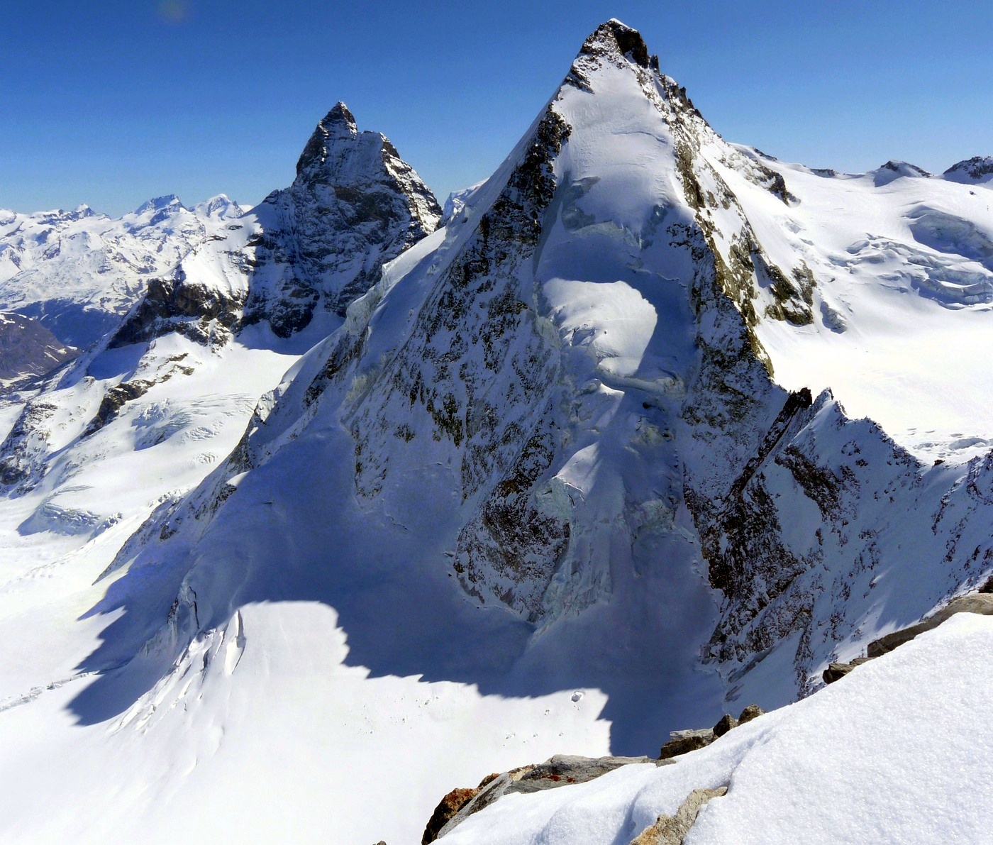45°58′35″ с. ш. 07°39′32″ в. д.GЯO | 4478 | 1027 | Пеннинские Альпы | 14 июля 1865 года, Э. Уимпер, Ф. Дуглас, М. Кро, Д. Р. Хэдоу, Ч. Хадсон, П. Таугвальдер-старший, П. Таугвальдер-младший[10] | ||
