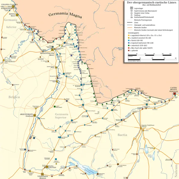 - Самая длинная прямая рукотворная линия была образована участком Римского лимеса длиной 81 259 м в Германии. Линия укреплений проходила по холмистой и густо поросшей лесом местности совершенно линейно, отклоняясь по всей своей длине только один раз, на расстояние в 1,6 км, чтобы избежать крутой долины. Необычайная точность выравнивания была приписана «громе», геодезическому инструменту, который римляне использовали с большим успехом при разделении земель и строительстве дорог.[103]