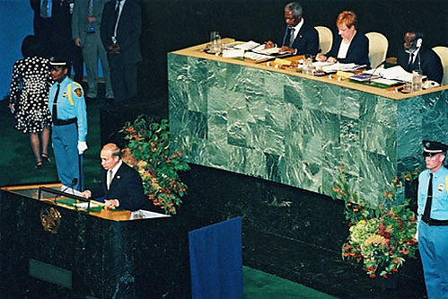 6−8 сентября — рабочий визит в Нью-Йорк (США). Участие в «Саммите тысячелетия». Встречи с президентом США Биллом Клинтоном, с председателем КНР Цзян Цзэминем, с канцлером ФРГ Герхардом Шрёдером, с президентом Индонезии Абдуррахманом Вахидом, с президентом Кипра Главкосом Клиридисом, с президентом Ирана Сейедом Мохаммадом Хатами, с президентом Турции Ахметом Недждетом Сезером, с президентом Мексики Эрнесто Седильо, с премьер-министром Израиля Эхудом Бараком, с президентом ЮАР Табо Мбеки, с президентом Венесуэлы Уго Чавесом, с премьер-министром Великобритании Энтони Блэром, с председателем Госсовета и Совета министров Кубы Фиделем Кастро, с президентом Южной Кореи Ким Дэ Чжуном, с генеральным секретарём ООН Кофи Аннаном, с премьер-министром Норвегии Йенсом Столтенбергом[21].