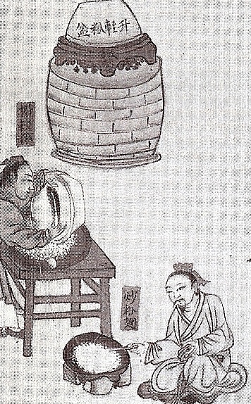 - Высокоалкогольное пиво: обычное пиво в древнем мире, от Вавилона до Древнего Египта, содержало алкоголь от 4 % до 5 %, никакое пиво на Западе не достигало содержания спирта выше 11 %, вплоть до XII века, когда в Италии появился дистиллированный алкоголь.[87] В Китае в эпоху династии Шан (1600—1050 до н. э.) тоже употреблялось обычное пиво, которое даже упоминается в надписях на гадательных костях как подарок духам во время жертвоприношений. Роберт Темпл пишет: «Основная проблема с обычным пивом заключается в том, что крахмал в зерне не может подвергнуться ферментации. Тысячи лет назад было обнаружено, что проросшие зёрна содержат вещество (фермент, в настоящее время известен как амилаза), которое превращает крахмал зерна в сахар, который затем может подвергнуться ферментации. Это является основой древнего пива в мире.»[88] Тем не менее, около 1000 г. до н. э. китайцы создали алкогольный напиток, который был крепче 11 %, новый напиток, который упомянут в поэзии династии Чжоу (1050—256 до н. э.) Новый процесс, названный сяо ми цзю (小米酒), Темпл описывает так: «Слегка проваренные зёрна пшеницы (иногда проса) смешиваются с землёй, и эта смесь должна покрыться плесенью. Эта плесень производит фермент амилазы более эффективно, чем пророщённые зёрна. Полученную смесь из плесени и дрожжей китайцы затем смешивали с отваренным в воде зерном, в результате чего получается пиво. Амилаза расщепляет крахмал в сахар, а дрожжи ферментируют его в спирт.» Китайцы обнаружили, что добавление отваренного в воде зерна во время брожения увеличивает содержание алкоголя. Позже этот же процесс японцы стали использовать при изготовлении саке или нихонсю (日本酒).