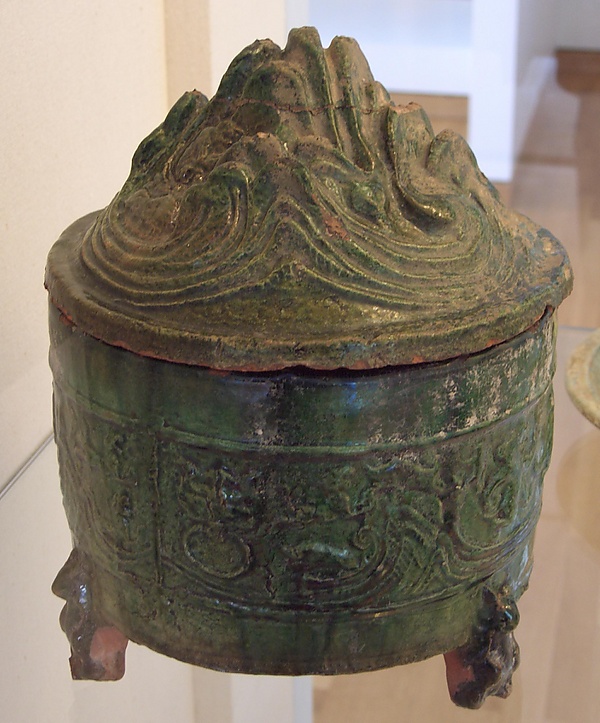 - Керамический треножник: Керамические треножники были характерны для северной части Китая, начиная с неолитической культуры Пэйлиган и до конца династии Шан (1600—1050 до н. э.).[32] Керамические миски и горшки на трёх ножках обнаружены на нескольких стоянках, относящихся к культуре Пэйлиган (7000 — 5000 до н. э.), в том числе на типовой стоянке этой эпохи Цзяху и стоянках Шуйцюань, Шигу и Бэйган. Треножники использовались как сосуды для приготовления пищи, например, с полыми ножками (ли), с плотными ножками (дин), разливочный кувшин (гуй), все они сделаны с тремя ножками и стоят на земле. За пределами материковой части Китая керамические треножники неолитической эпохи были найдены только на Тайване и в континентальной части Юго-Восточной Азии. Находки треножников на стоянке Бан Као подняло вопрос о связи треножников Юго-Восточной Азии с другими аналогичными предметами материковой части Китая. Птицеобразные керамические треножники, найденные, например, в уезде Хуа провинции Шэньси, и гуй середины и конца культуры Давенкоу (3500 — 2600 до н. э.), возможно, были связаны с мифологической трёхногой птицей или золотой вороной.[33] Самые ранние изображения трёхногой птицы найдены на керамике из культуры Майодигоу (4000 — 3000 до н. э.) в провинции Хэнань, они также упоминаются в Хуайнаньцзы и Ши-цзи.