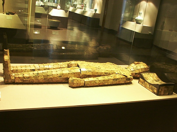 - Погребальное одеяние из нефрита: Захоронения в одеянии из нефрита существовали в Китае в эпоху династии Хань (202 до н. э.—220 г. н. э.). В подтверждение древних записей о величии и благородстве династии Хань и захоронении в нефритовых одеяниях, археологи обнаружили в июне 1968 года в провинции Хэбэй гробницу и захоронения в нефритовых одеяниях принца Лю Шэна (ум. 113 до н. э.) и его жены Ван Доу.[226] Одеяние Лю из двенадцати гибких частей, состоит из 2690 квадратных кусочков зелёного нефрита с отверстиями, проколотыми по четырём углам, так чтобы их можно было сшить вместе золотой нитью. Общий вес золотой нити, используемой в одеянии, составляет 1110 г (39 унций). Одеяние принцессы Ван Доу сделано из 2156 кусочков нефрита, скреплённых вместе золотыми нитями весом 703 г (24,7 унции). Хотя нефритовые украшения и маски на голове появляются в захоронениях в начале династии Хань, захоронения с полным одеянием не делались до царствования императора Вэнь-ди (правил 180—157 до н. э.), а самое древнее найдено в округе Сюйчжоу. В общей сложности между 1954 и 1996 годами было обнаружено 22 захоронения эпохи Западная Хань (202 до н. э.—9 г. н. э.) и 27 захоронений эпохи Восточная Хань (25—220 н. э.) с полными и частичными нефритовыми одеяниями. Они встречаются в основном в провинциях Хэбэй, Шаньдун, Хэнань и Цзянсу, в городах Сяньян, Бочжоу, Гуанчжоу, Мавандуй, Мяньян и Цюйцзин. Захоронения с нефритовым погребальным одеянием постепенно исчезли после того, как они были запрещены в 222 году императором Цао Пэйем.[227]