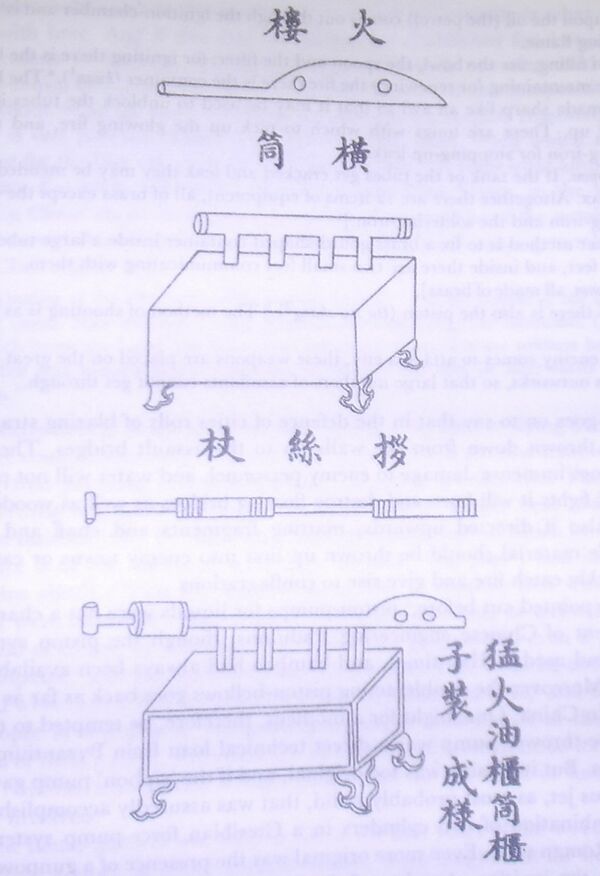 - Двухструйный огнемёт: Хотя одноструйный огнемёт был впервые разработан в Византии в VII веке,[95] китайский огнемёт или «ручка Хо Ци» X века отличался от него непрерывным потоком пламени с применением двухпоршневого шприца (который был известен со времён династии Хань). Огнемёт извергал фонтан греческого огня, импортировавшегося благодаря морским торговым контактам Китая с Ближним Востоком. Его первое описание восходит к 917 г., а первое использование в бою датируется 932 г., эпохой пяти династий и десяти царств (907—960). Первая его иллюстрация найдена в военном манускрипте 1044 г. Уцзин Цзуняо начала династии Сун (960—1279), в котором также описано подробное устройство этого оружия. В отличие от греческой модели, которая использовала топку, «ручка Хо Ци» воспламенялась от порохового зажигательного запала.[96][97]