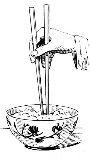 - Палочки для еды: Историк Сыма Цянь (145—86 до н. э.) в труде Ши цзи написал, что император Ди Синь первым воспользовался палочками из слоновой кости в XI веке до н. э. Самые древние палочки для еды из бронзы найдены археологами в гробнице 1005 стоянки Шан в Хоуцзячжуане, округ Аньян, и относятся примерно к 1200 г. до нашей эры. К 600 г. до н. э. использование палочек распространилось на провинцию Юньнань (Дапона в уезде Дали),[212][213] а к I столетию также на Центральный аймак в Монголии.[214] Самая ранняя известная запись об использовании палочек обнаружена в философском тексте Хань Фэйцзи, написанном Хань Фэйем (ок. 280—233 до н. э.) в III веке до нашей эры.[215]