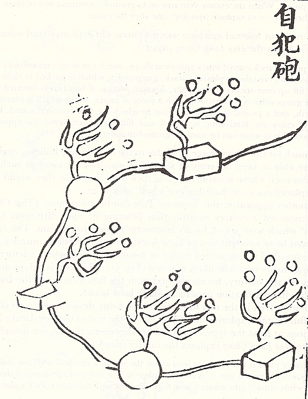 - Наземная мина: Летописные данные свидетельствуют о том, что первое использование наземных мин в истории произвёл бригадный генерал эпохи империи Сун (960—1279), известный как Лоу Цинся, который использовал 'огромную бомбу' (huo pao), чтобы уничтожить монгольских агрессоров, вторгшихся в Гуанси в 1277.[202] Но первое подробное описание наземной мины было дано в военном манускрипте «Холунцзин», написанном Цзяо Юем (XIV — начало XV в.) и Лю Цзи (1311—1375) в конце эпохи династии Юань (1271—1368) и в начале эпохи империи Мин (1368—1644). Цзяо и Лю писали, что наземные мины были сферическими, изготовленными из чугуна, и их фитиль воспламенялся от механизма, срабатывающего от передвигающихся вражеских войск. Хотя Цзяо и Лю не описали этот срабатывающий механизм во всех деталях, в более позднем тексте 1606 года сказано, что при движении врагов освобождался штырь, отчего падала скрытая под землёй гиря и тянула струну, которая вращала колесо, действующее как кремень. В результате вспыхивала искра, поджигающая фитиль.