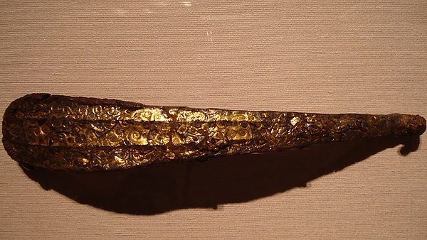 - Гэ: Кинжал-топор или гэ был разработан из земледельческих каменных орудий в эпоху неолита, археологи находят каменные гэ, относящиеся к культуре Луншань (3000-2000 до н. э.) на стоянках Мяодянь, провинция Хэнань. Гэ появился также в качестве церемониального и символического оружия из нефрита примерно в это же время, два таких, датируемые примерно 2500 г. до нашей эры, найдены на стоянке Линцзятань в провинции Аньхой.[13] Первые бронзовые гэ появились в эпоху ранней бронзы на стоянке Эрлитоу,[13] где в 2002 г. были найдены 2 гэ среди более чем 200 бронзовых изделий, там же были найдены 3 нефритовых гэ.[14] 72 бронзовых гэ обнаружены в гробнице 1004 на Хоуцзяжуан в Аньянге, 39 нефритовых гэ — в гробнице Фу Хао и свыше 50 нефритовых гэ на стоянке Цзиньша были найдены поодиночке.[13] Гэ был основным оружием пехоты эпохи Шан (ок. 1600—1050 до н. э.) и Чжоу (1050—256 до н. э.), хотя он иногда использовался «гарпунёром» из экипажа колесниц. Гэ состоял из длинного деревянного древка с бронзовым лезвием на конце под прямым углом к древку. Оружие можно было двигать к себе или от себя, чтобы захватить и порезать противника. В начале династии Хань (202 до н. э.—220 н. э.) военное применение бронзовых гэ стало весьма ограниченным (осталось в основном церемониальное), они были постепенно заменены железными копьями и алебардами цзи.