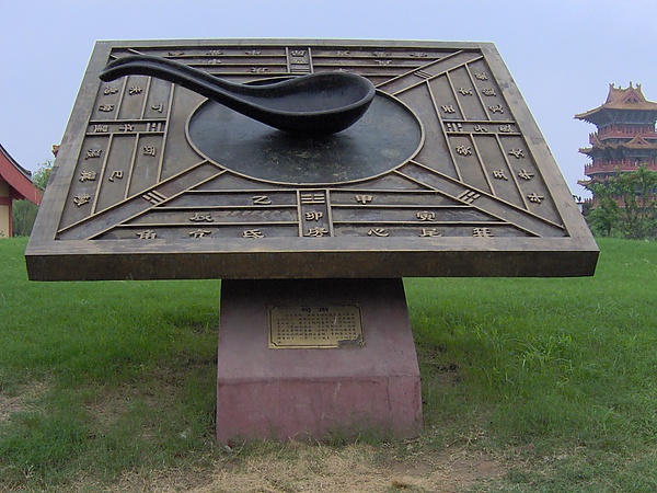 Обнаруженный в Сан-Лоренцо Теночтитлан, штат Веракрус, Мексика древний артефакт из гематита ольмекской эпохи, датируемый приблизительно 1000 годом до н. э., указывает на то, что в Центральной Америке, возможно, использовали компас из магнитного железняка задолго до того, как он был описан в Китае, хотя ольмеки не знали железа, а китайцы после его открытия поняли, что оно намагничивается при контакте с магнитным железняком.[7] Описание притягивания железа гематитом встречается в древних китайских трактатах: Чжуанцзы, Вёсны и осени господина Люя (呂氏春秋) (Master Lu’s Spring and Autumn Annals) и Хуайнань-цзы.[8] В эпоху династии Хань (202 до н. э. — 220 н. э.) китайцы начали использовать ориентированный в направлении север-юг магнитный железняк в компасах ковшово-чашечного типа в геомансии и других гаданиях, а не для навигации. В классическом тексте Луньхэн (en:Lunheng), написанном Ван Чуном (27 — 100 н. э.), в главе 52 написано: «Этот инструмент похож на ложку, и когда его кладут на тарелку на земле, его ручка указывает на юг».[9] Шэнь Ко (1031—1095), живший в эпоху империи Сун (960—1279), первым точно описал как магнитное склонение (отклонение от направления на истинный север), так и магнитный компас с иглой в своей книге «Записки о ручье снов» (梦溪笔谈) (en:Dream Pool Essays) в 1088 году. Другой автор, Чжу Юй, в своей книге, опубликованной в 1119 году, впервые упоминает о применении компаса для навигации на море.[10] Однако, ещё до этого, в военном манускрипте 1044 года «Уцзин цзунъяо» описан компас на основе остаточной намагниченности из нагретых железных или стальных болванок, отлитых в форме рыбы, и помещённых в чашу с водой. В результате остаточной намагниченности и индукции возникали слабые магнитные силы. В манускрипте зарегистрировано, что такой прибор использовался в качестве указателя курса наряду с механической «Колесницей, указывающей на юг» (см. ниже).