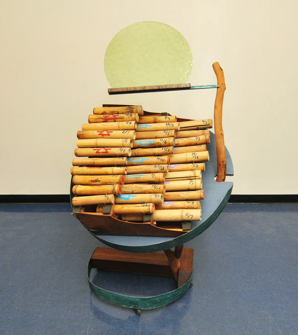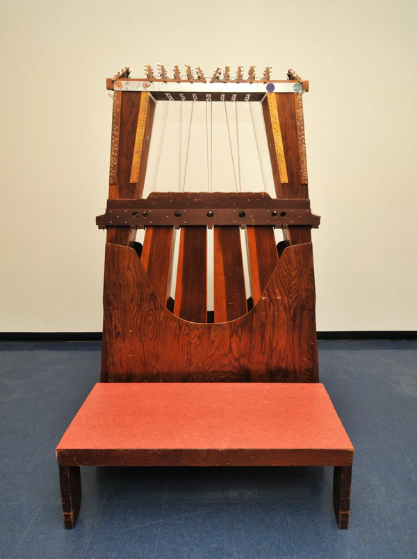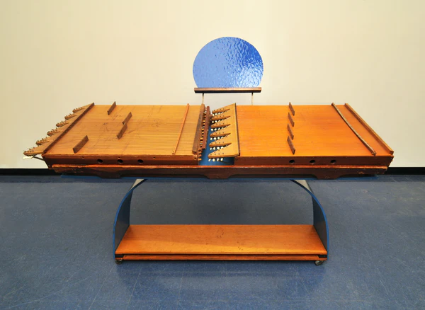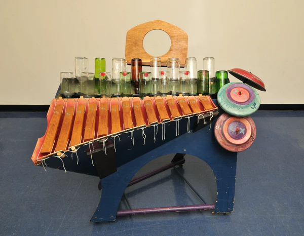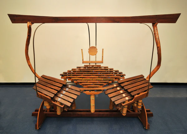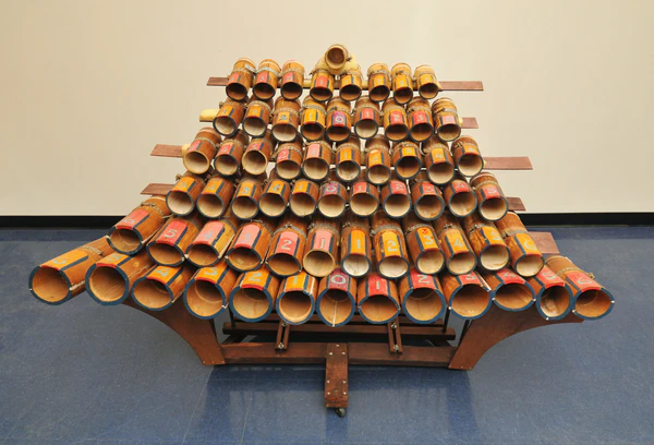 Двенадцать храмовых колоколов прикреплены к резонаторам тыквы на перекладине из эвкалипта. Конусовые гонги перестроены из носовых конусов бомбардирощиков Douglas Aircraft[15]. Первый инструмент появился в 1964 году.[13]