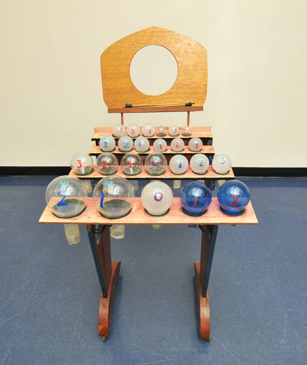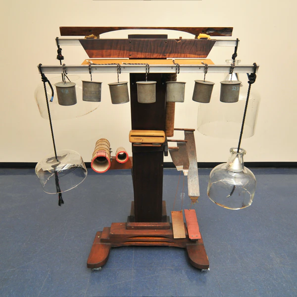 Облачно-камерные чаши объединяются в сет из 16-дюймовых пирексовых чаш, вырезанных из карбюраторов, подвешенных на раме. Карбюраторы были позаимствованы из Беркелейской национальной лаборатории и были перестроены Парчем в облачные камеры.[3][14] Первый такой инструмент был сконструирован Гарри Парчем в 1950 году.[13]