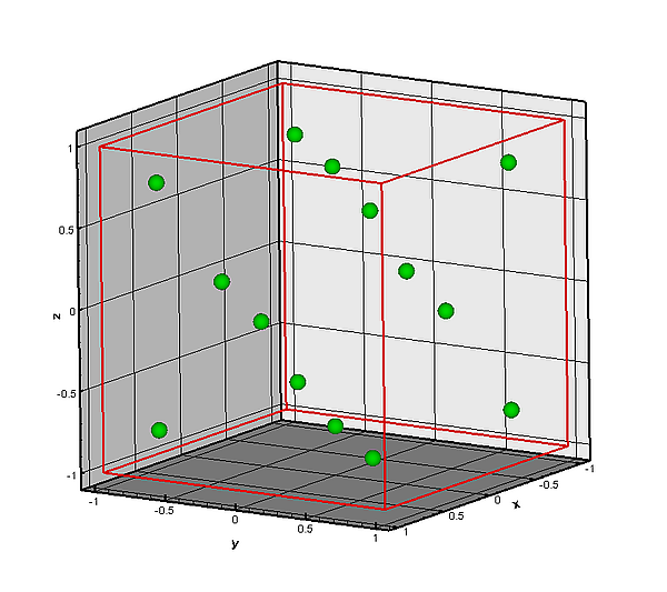 Так же, аналогично с квадратом, многие формулы интегрирования по кубу можно получить из формул интегрирования по отрезку, координаты узлов — это все возможные тройки координат одномерной формулы, а веса интегрирования — произведение соответствующих весов одномерной формулы.