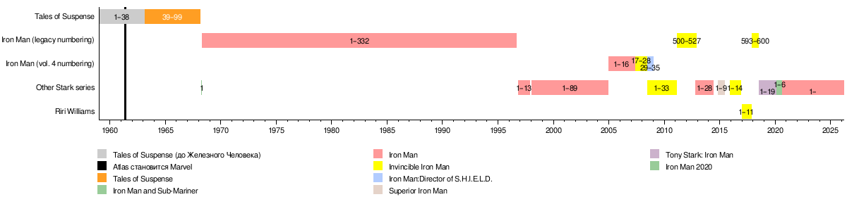 - Iron Man #1—332 (май 1968 — сентябрь 1996)