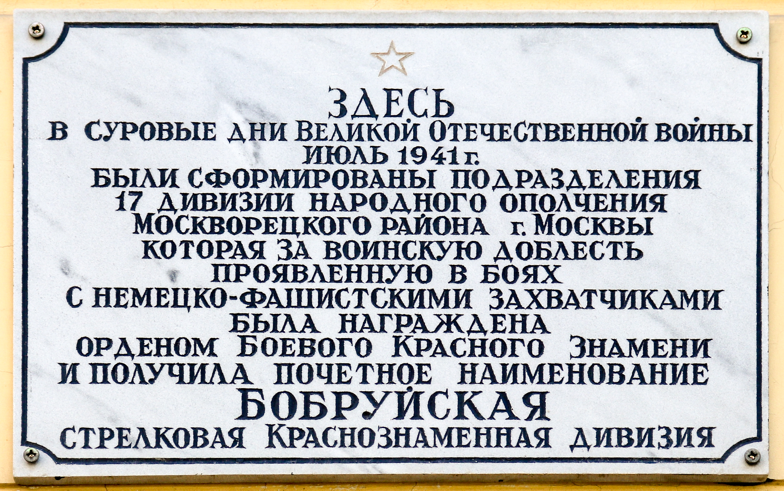 | Памяти событий Великой Отечественной войны | Улица Щипок, 4, стр. 1 | Доска из белого мрамора с изображением звезды |