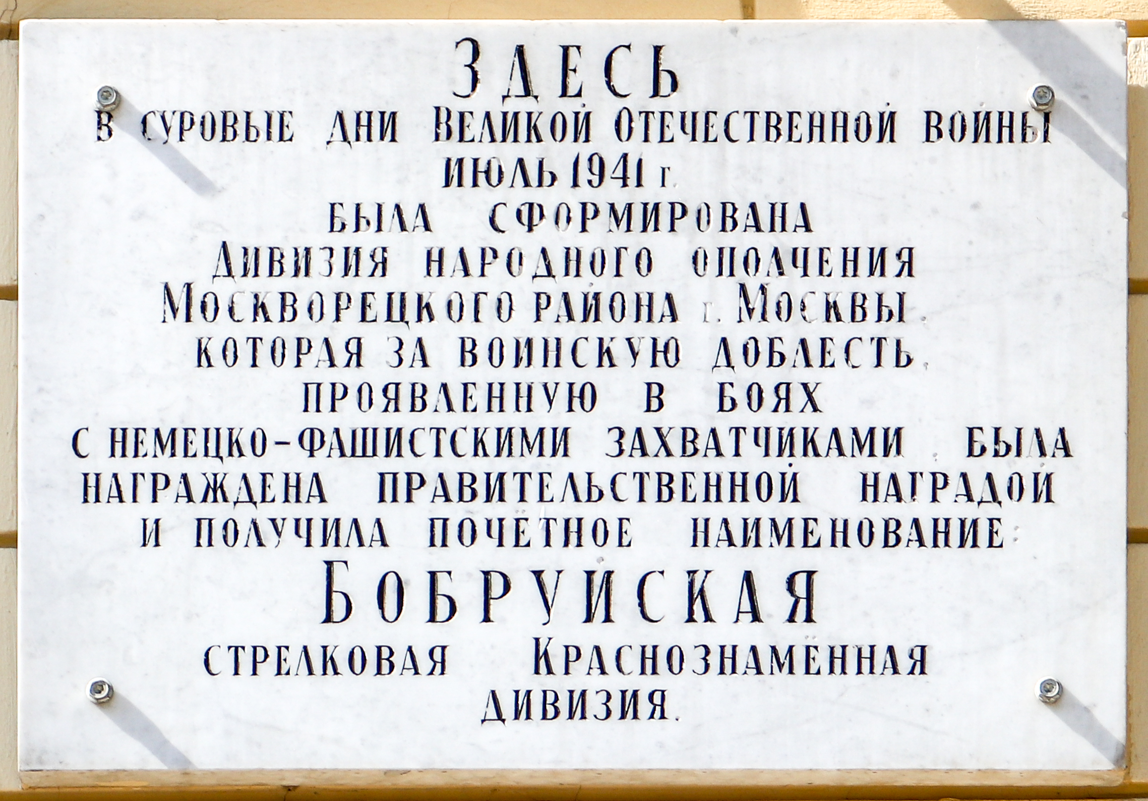 | Памяти 9-й Московской стрелковой дивизии народного ополчения | 2-й Новокузнецкий переулок, 13/15, стр. 4 Здание кондитерской фабрики «Рот Фронт» |