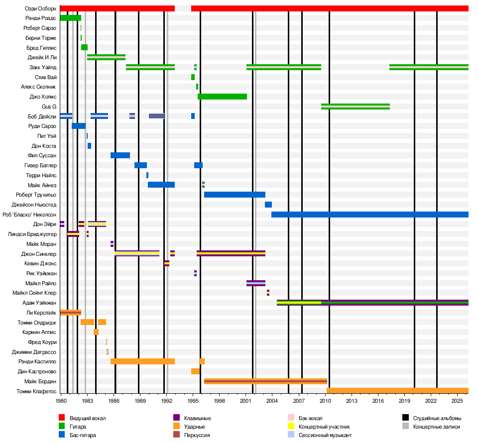 | Оззи Осборн | 1979-настоящее | ведущий вокал | все релизы Ozzy Osbourne | |