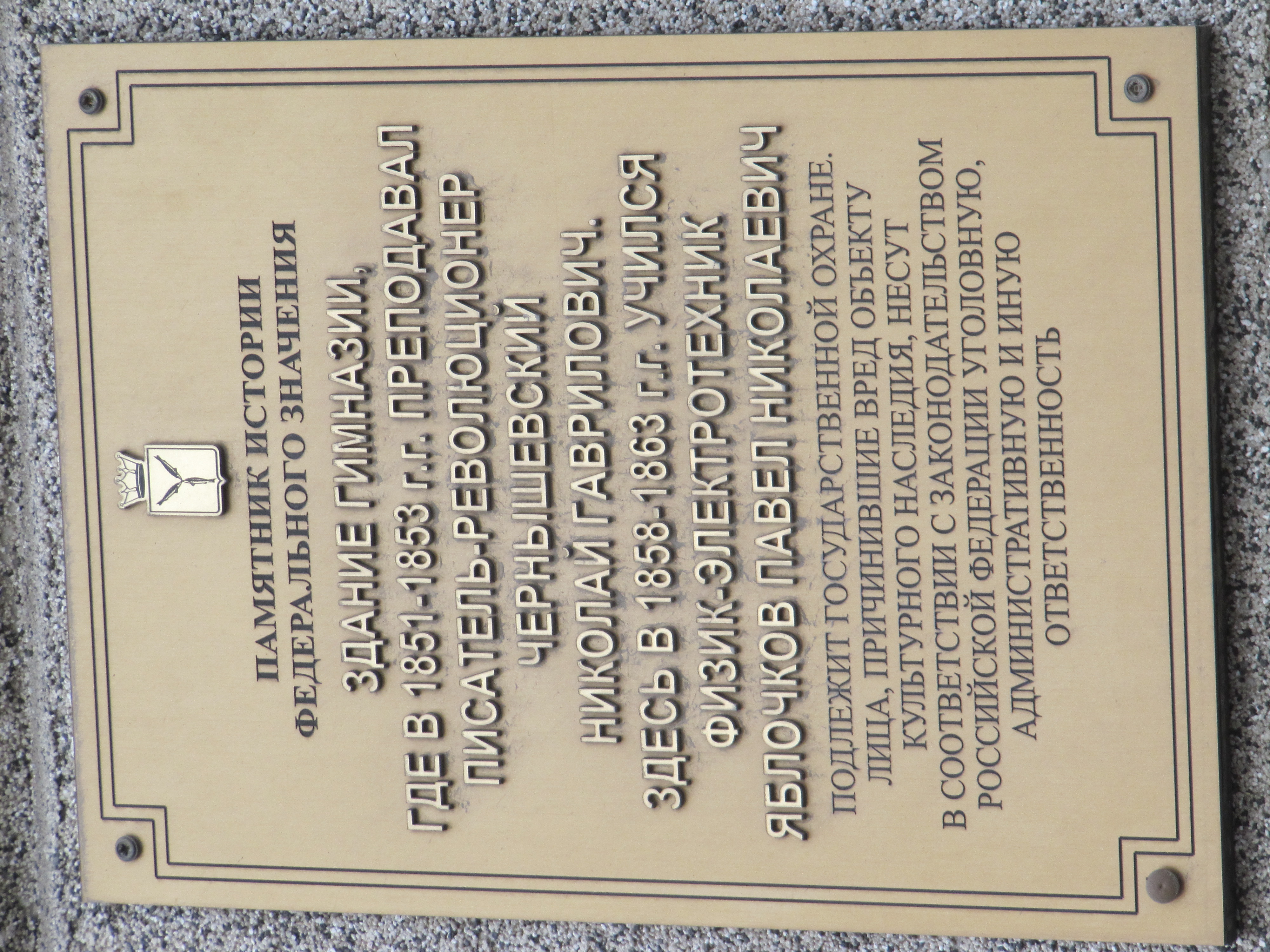 | 36) | 41. | Здание гимназии, где в 1851—1853 гг. преподавал писатель-революционер Чернышевский Николай Гаврилович. Здесь в 1858—1863 гг. учился физик-электротехник Яблочков Павел Николаевич | ул. Некрасова, 17 | |||