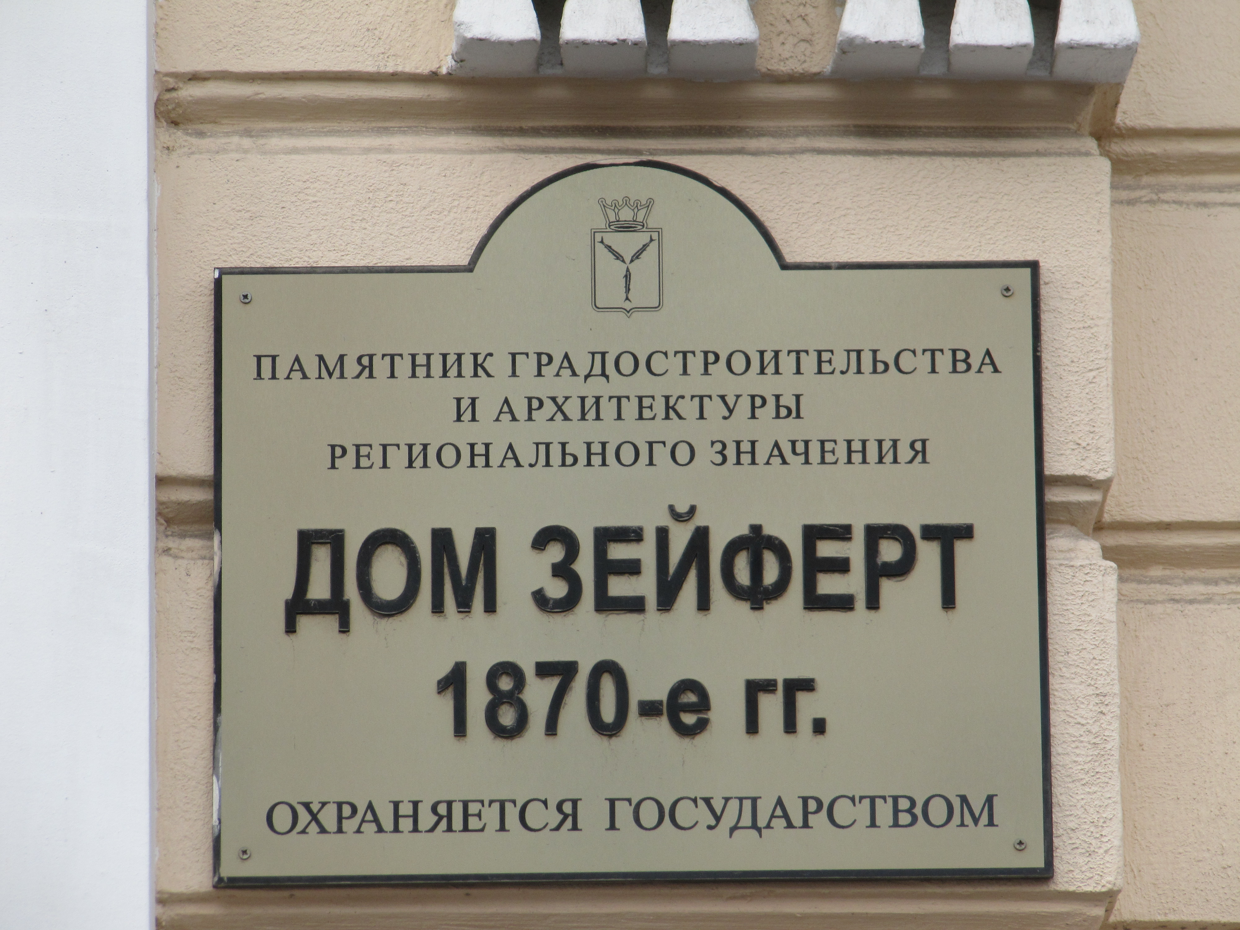 | 63. | Дом И. И. Зейферт, 1850-е гг., реконструкция 1889 г. — арх. Шустер О. И.; 1902 г. | Пр. Кирова, 18/