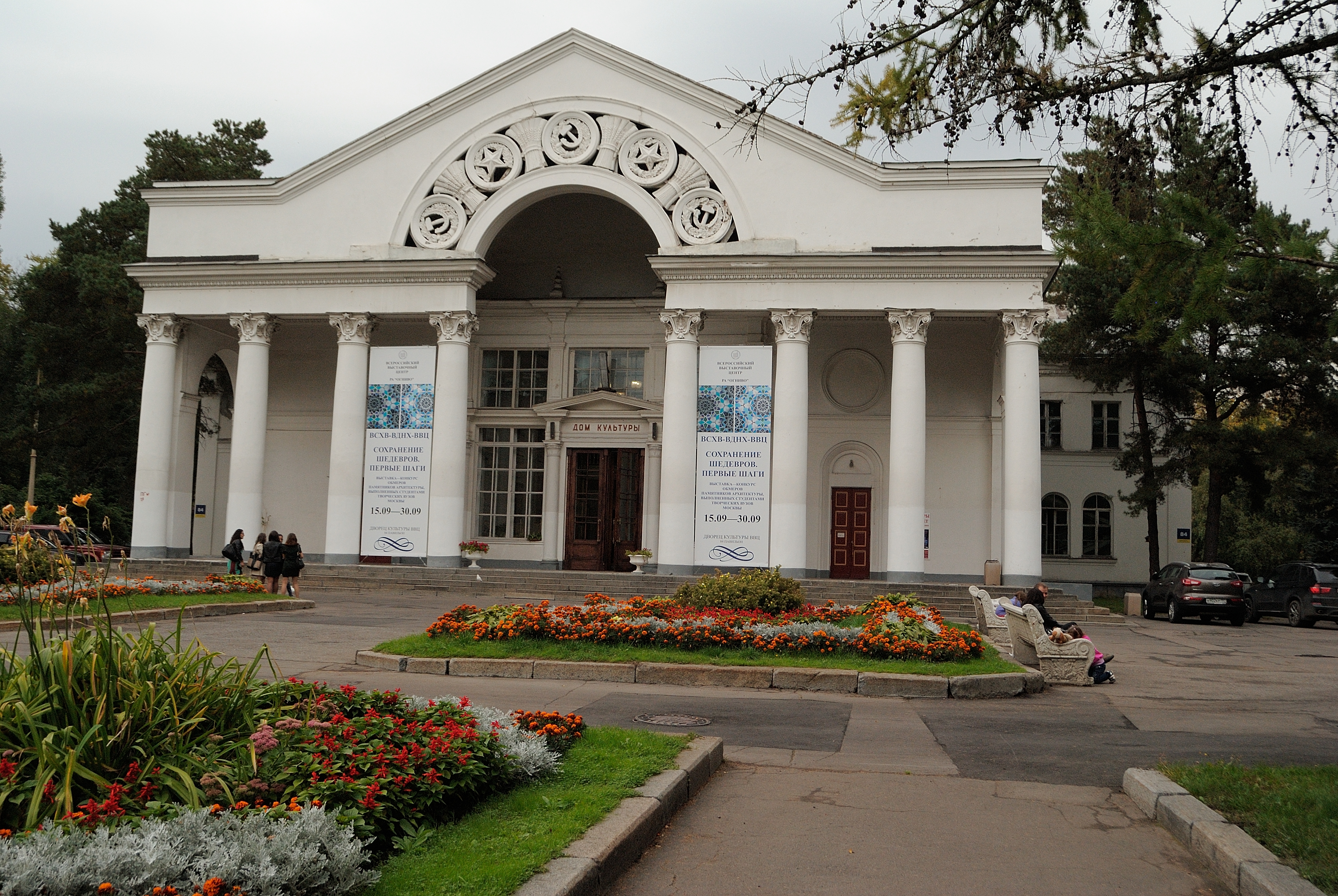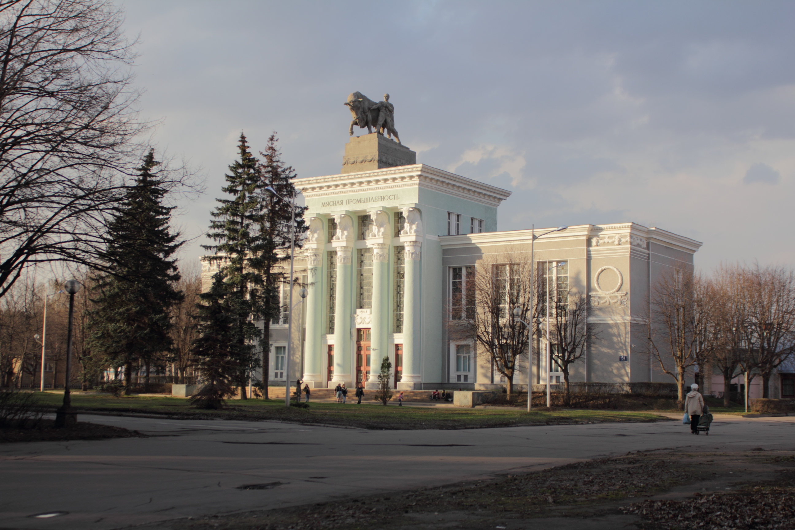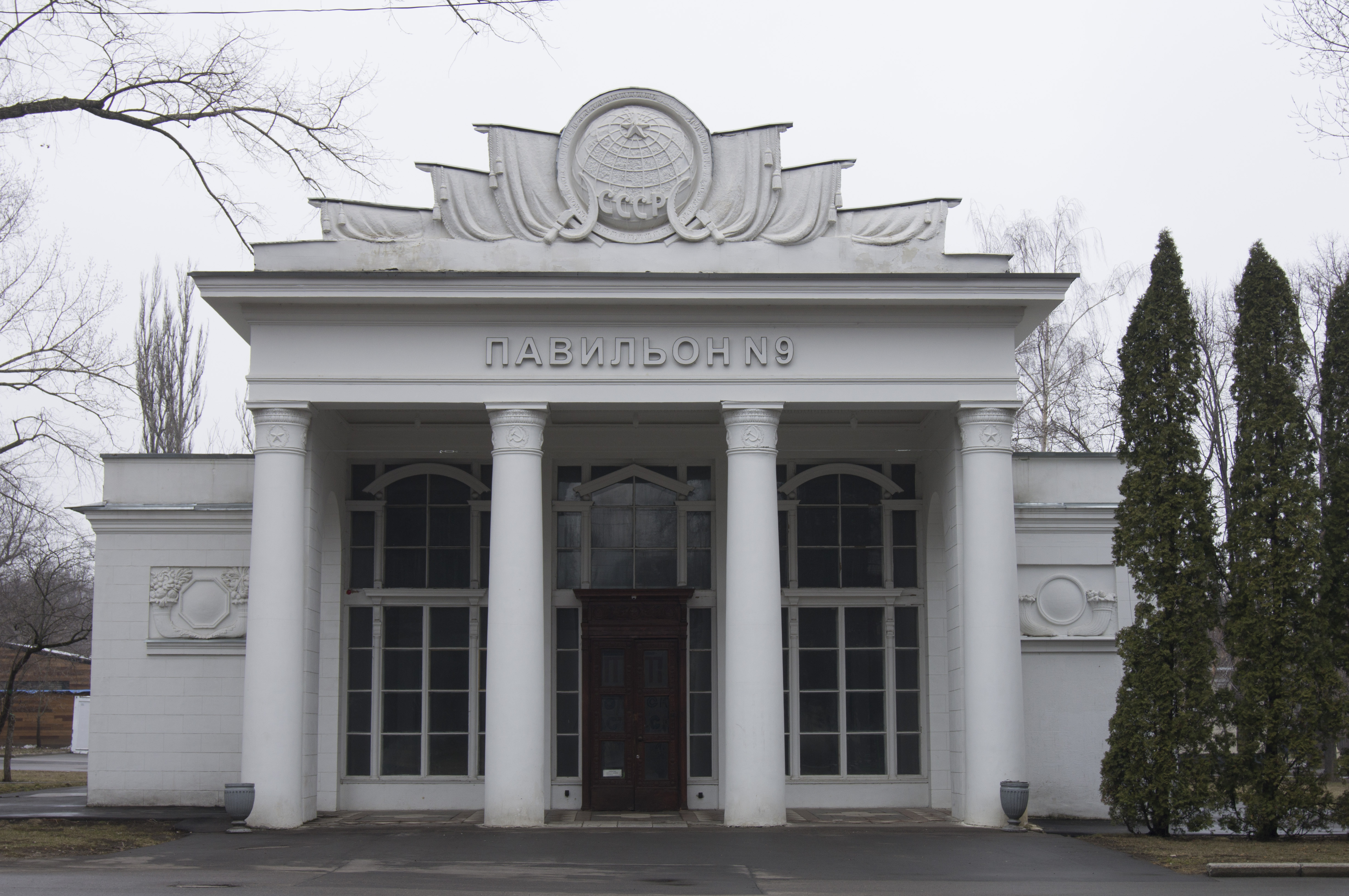 | Главный вход | Архитектор И. Д. Мельчаков. Скульпторы Г. И. Мотовилов (рельефы на пилонах), С. М. Орлов, А. П. Антропов, Н. Л. Штамм, С. Л. Рабинович, И. Л. Слоним (скульптура тракториста и колхозницы)[4]. | 1951—1954 | ||