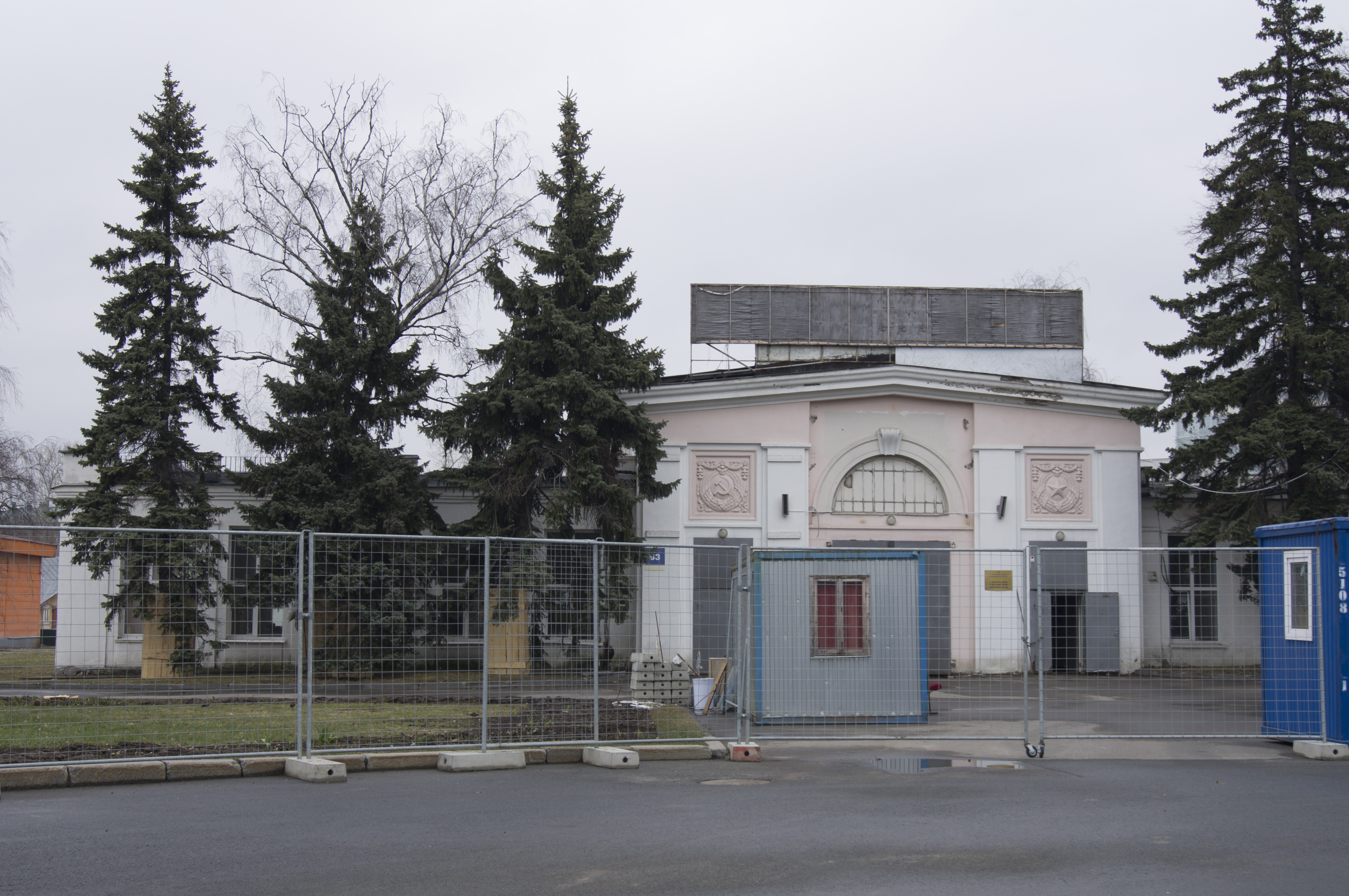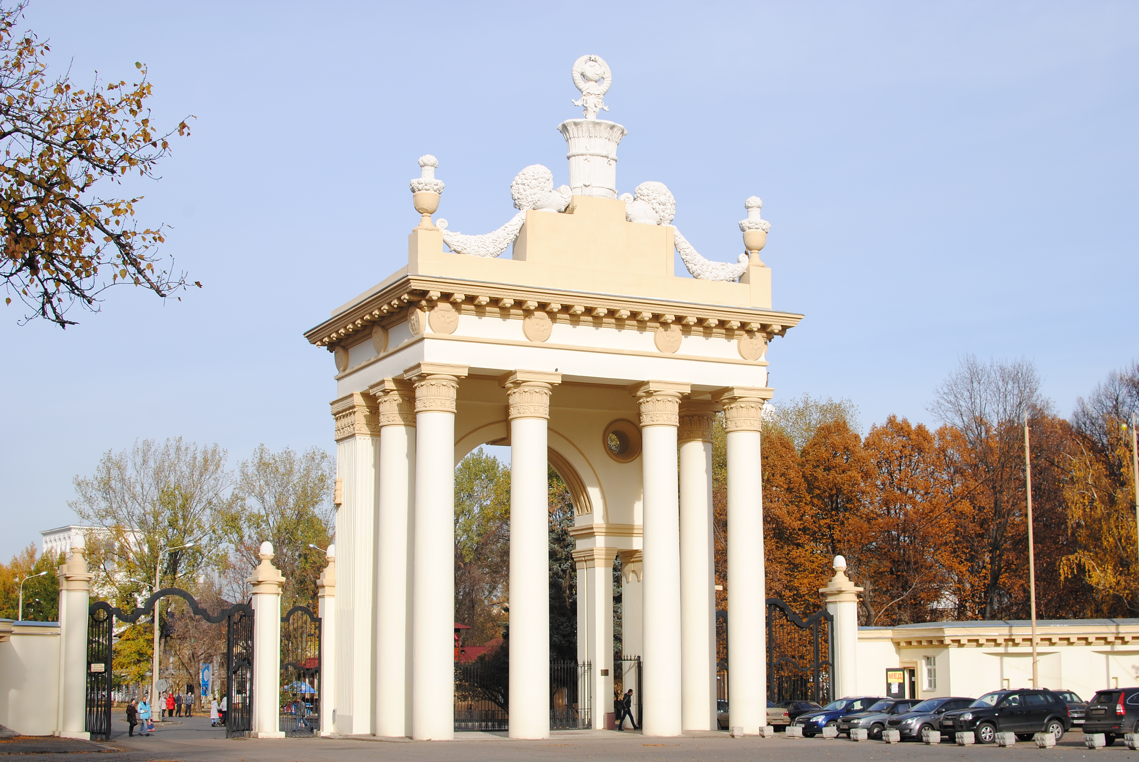 | Северный вход | Бывший главный вход ВСХВ 1939 г. | Первоначально выстроен в 1937 году (архитектор В. К. Олтаржевский), в 1939 году разобран и выстроен заново. Архитектор Л. М. Поляков. Скульптор Г. И. Мотовилов (рельефы на пилонах; не сохранились)[5][6]. | 1937—1939 | |