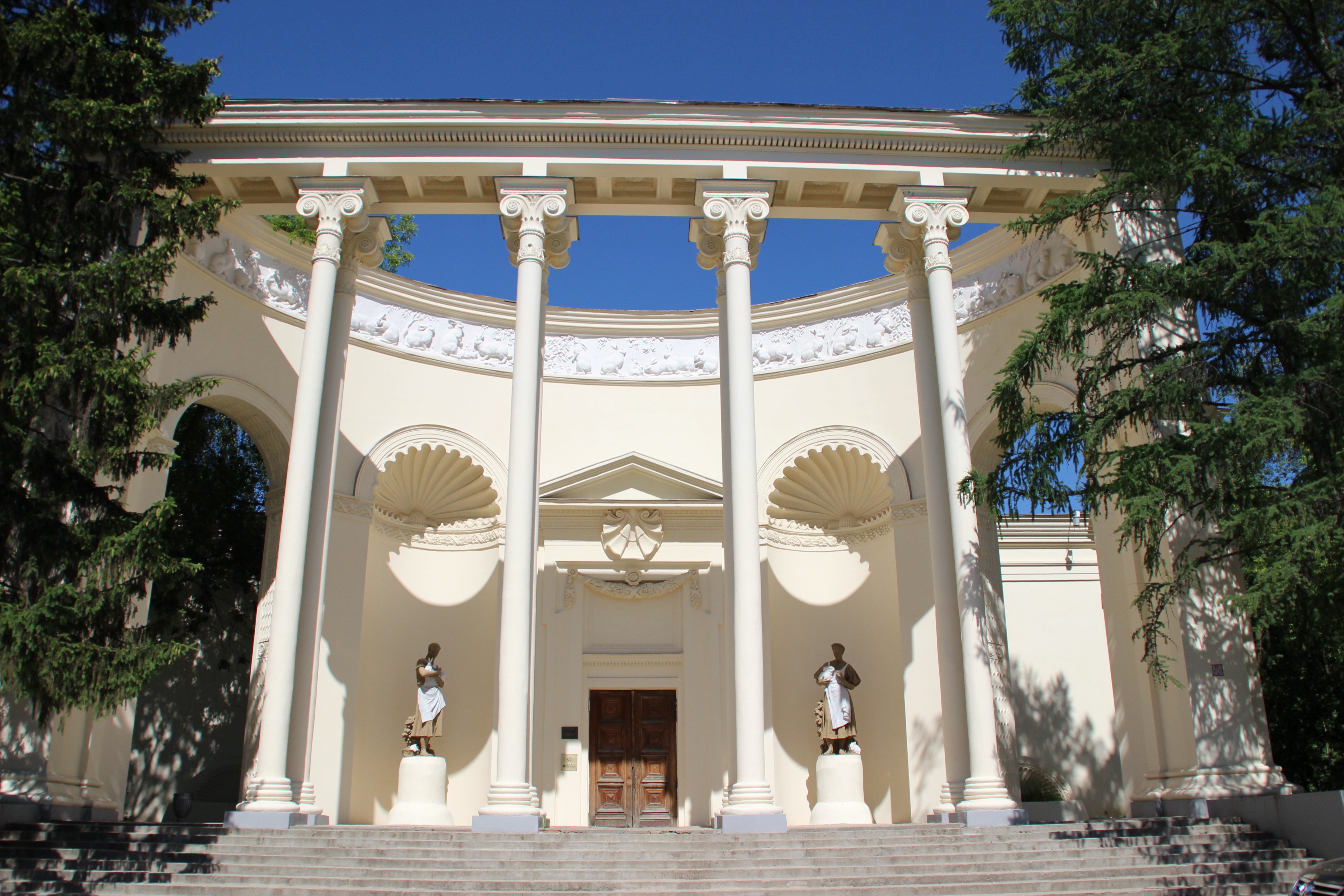 | «Ветеринария»[115] (павильон № 56; в 1939—1941 — «Ветеринария и искусственное осеменение»; в 1954—1955 — «Ветеринария и зоотехния»; в 1956—1958 — «Ветеринария/Медицинская промышленность». в 1959—1966 — «Здравоохранение и медицинская промышленность»; в 1967—30 августа 2011 — «Ветеринария») | 1937—1954, автор — художник А. С. Магидсон. Авторы реконструкции — архитектор А. О. Колесниченко. Художник С. Я. Сенькин[116] |