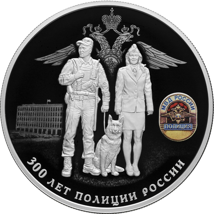 серебро | 300 лет полиции России. Современные сотрудники полиции со служебной собакой на фоне здания Министерства внутренних дел Российской Федерации. | |||