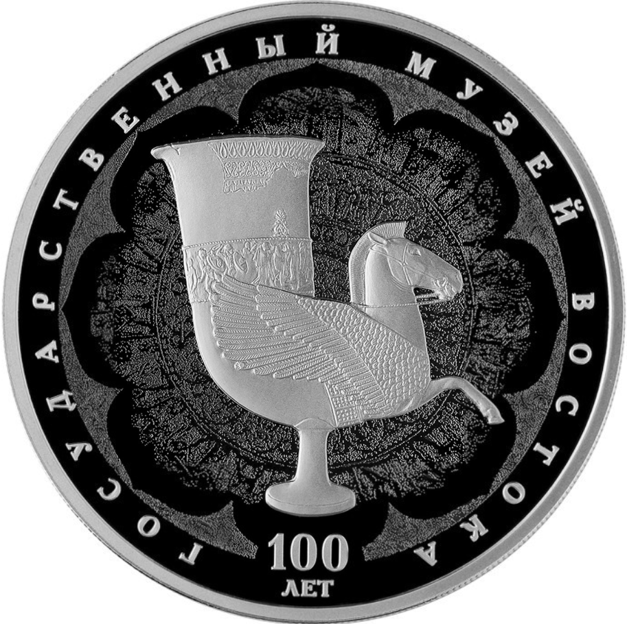 серебро | 100-летие Государственного музея искусства народов Востока. Кубок со скульптурным изображением Пегаса на фоне узора непальской мандалы. | |||