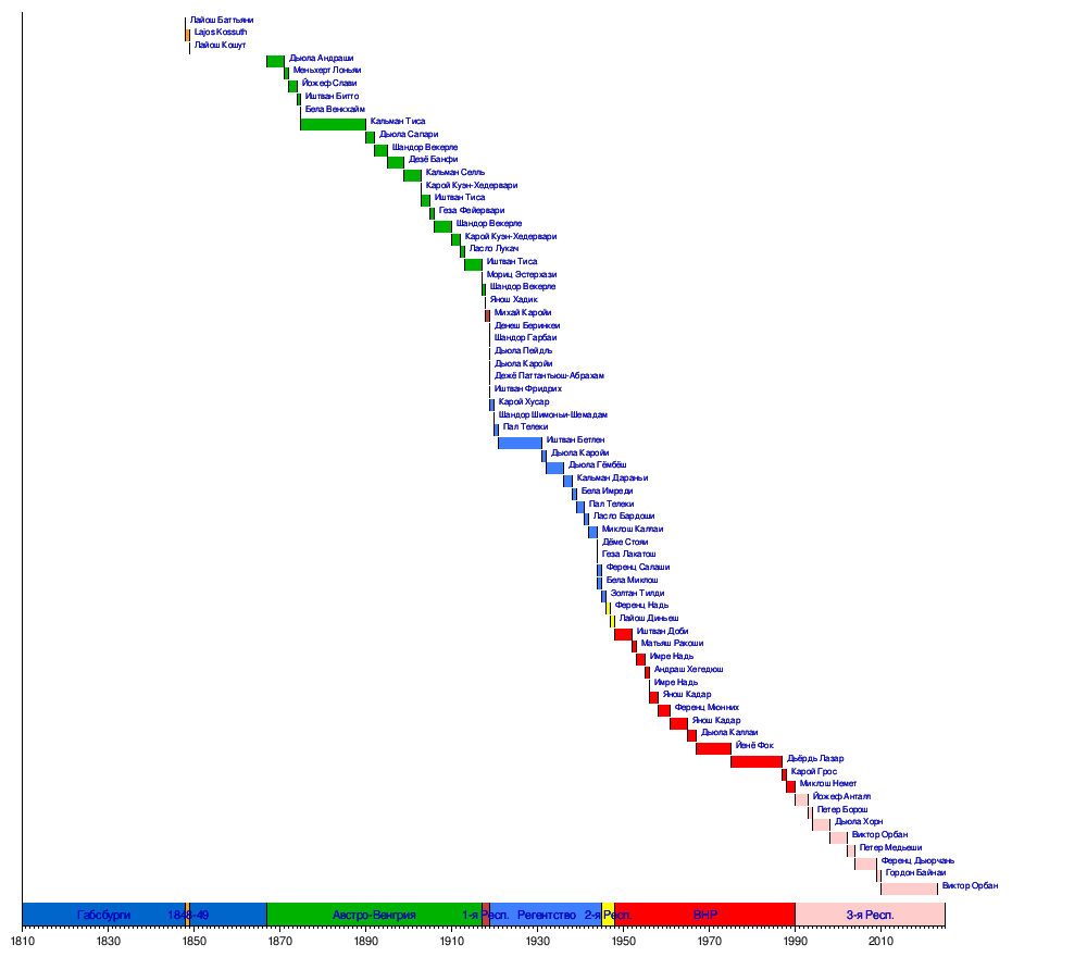 Должность главы правительства Венгрии была учреждена в 1848 году. 17 марта 1848 года король Фердинанд V назначил Лайоша Баттьяни первым премьер-министром страны. Занимающий пост в настоящее время Виктор Орбан вступил в должность 29 мая 2010 года[4][5][6].