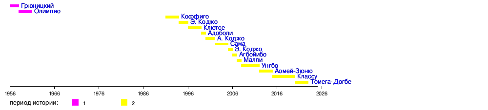 | 2 | Сильванус Эпифанио Олимпио (1902—1963) фр. Sylvanus Epiphanio Olympio |