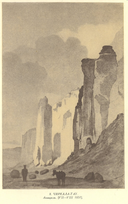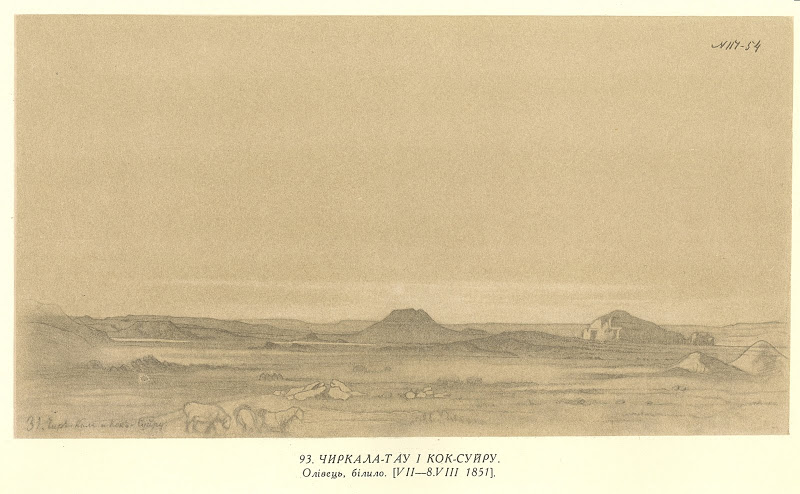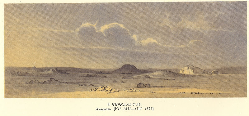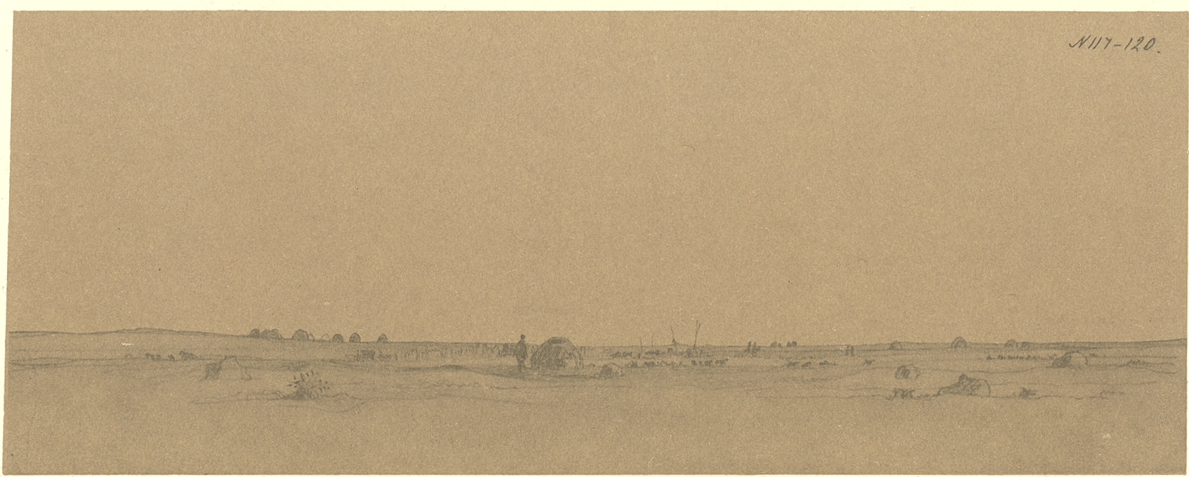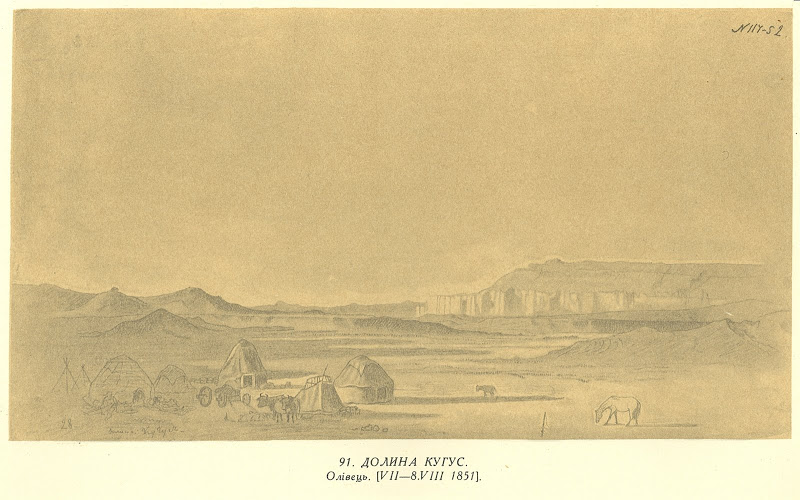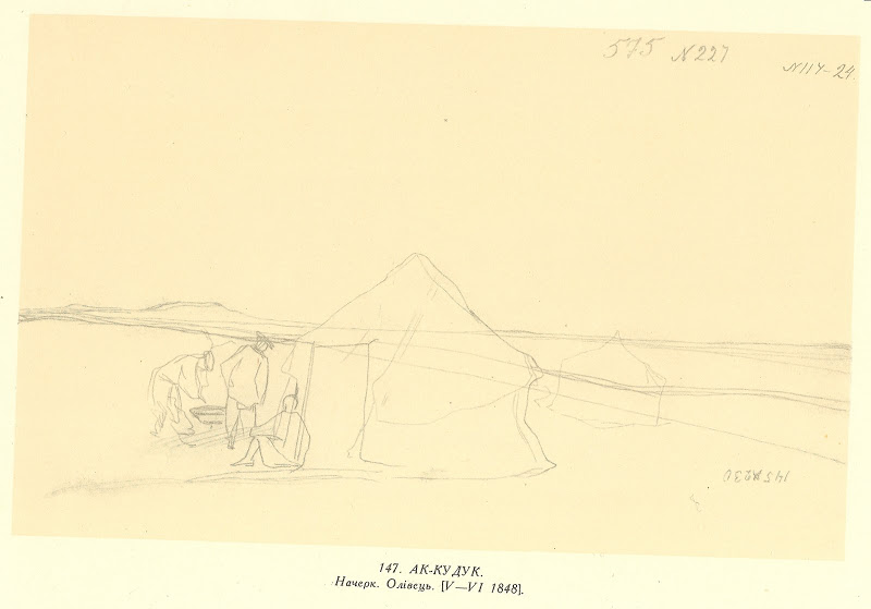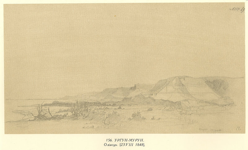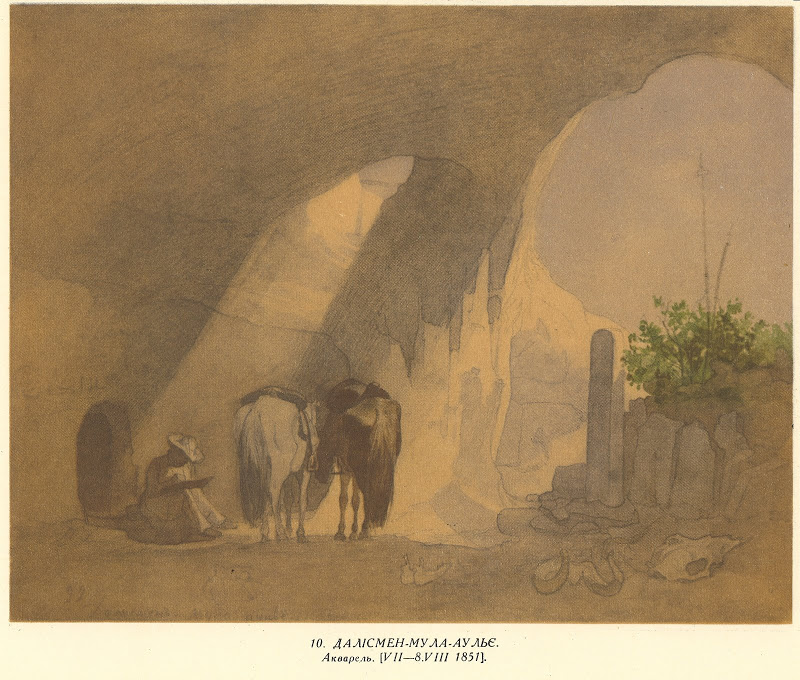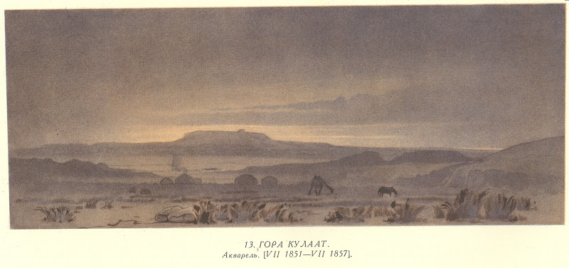 | Пейзаж с холмами и юртой. | Бумага, акварель, тушь | 21,2×36,6 | июль — август 1838 |