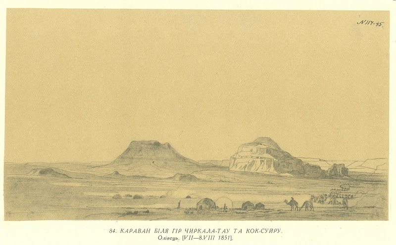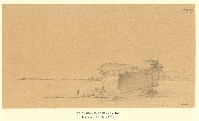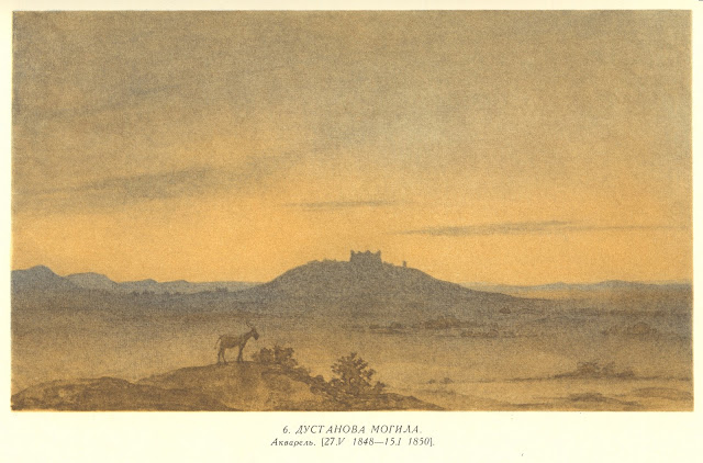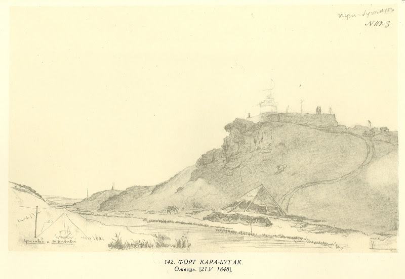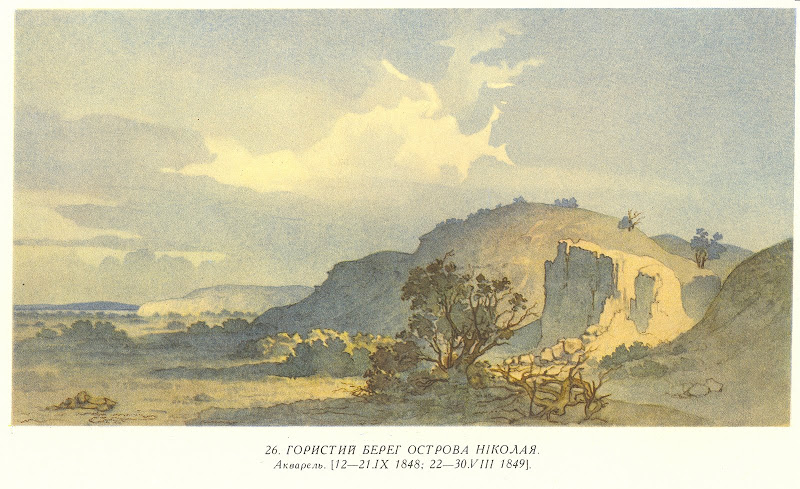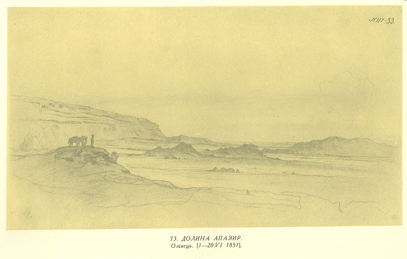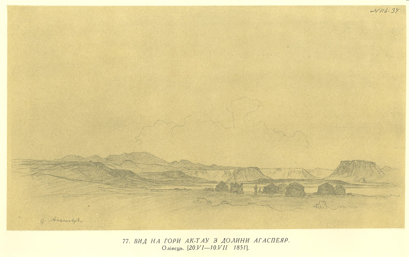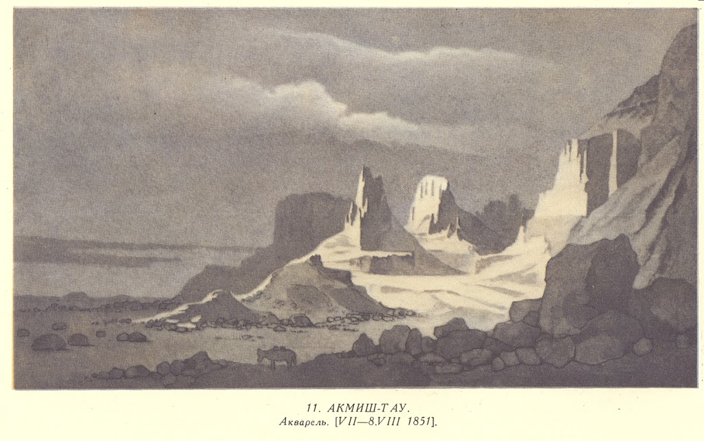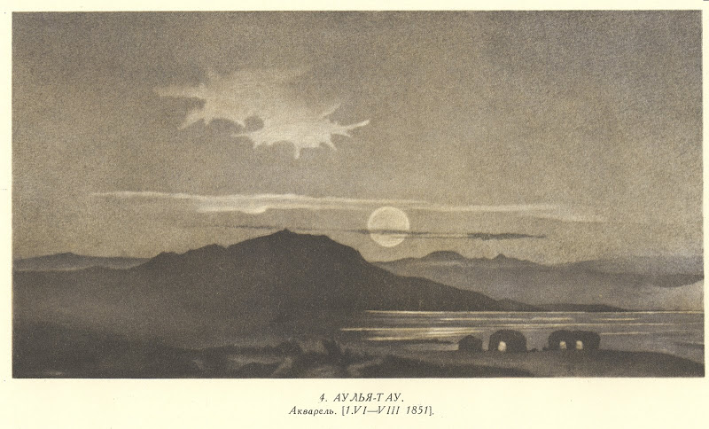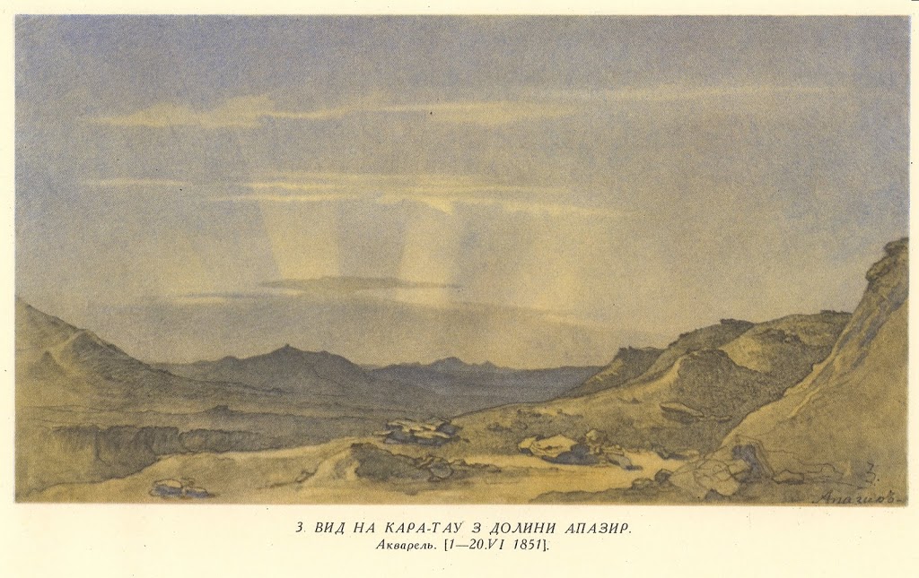 | Пейзаж с холмами и юртой. | Бумага, акварель, тушь | 21,2×36,6 | июль — август 1838 |