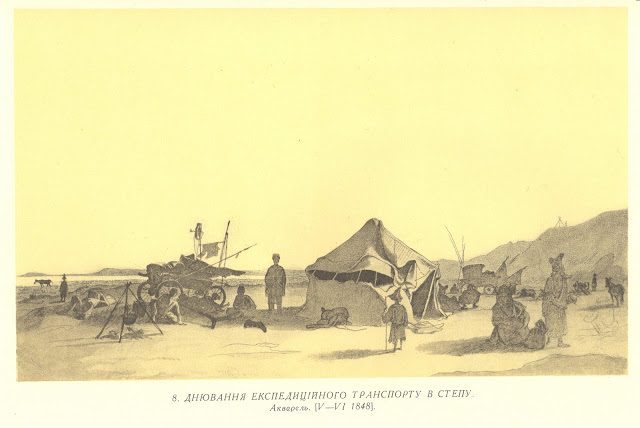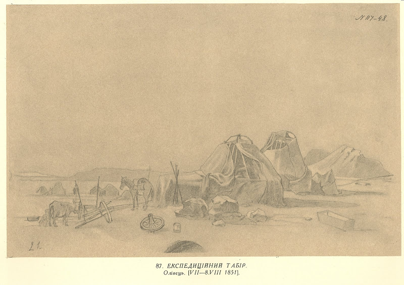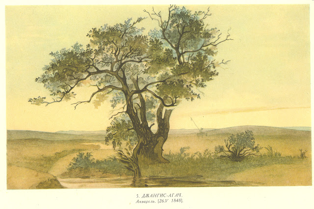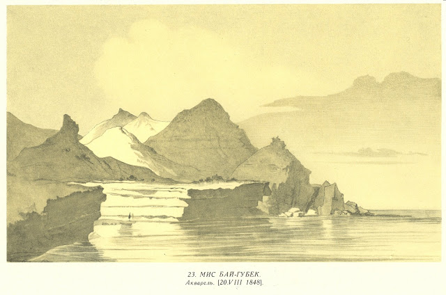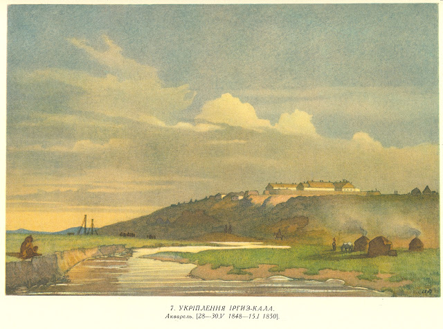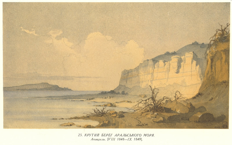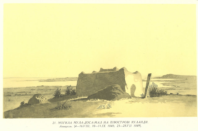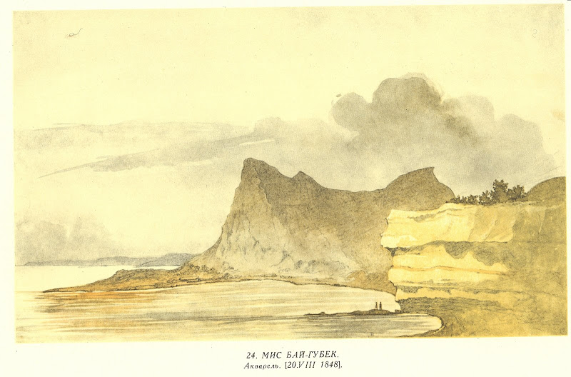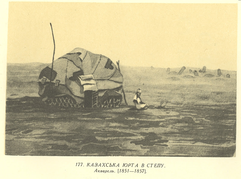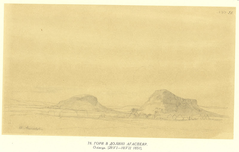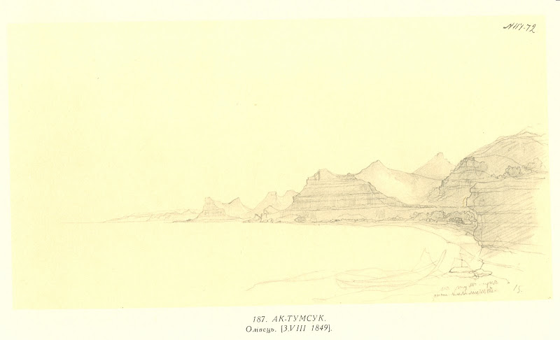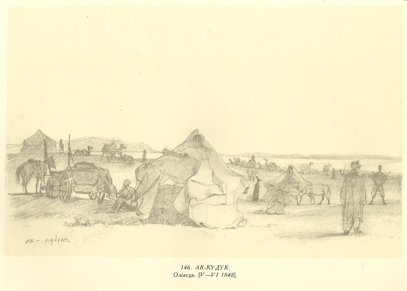 | Пейзаж с холмами и юртой. | Бумага, акварель, тушь | 21,2×36,6 | июль — август 1838 |