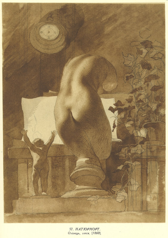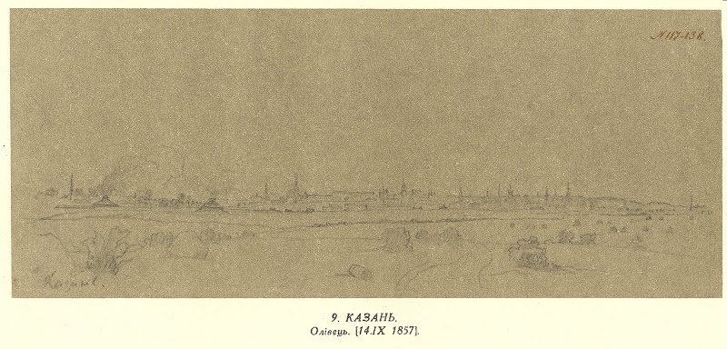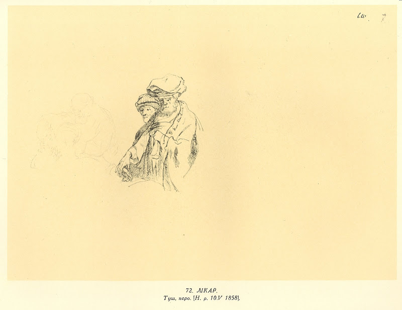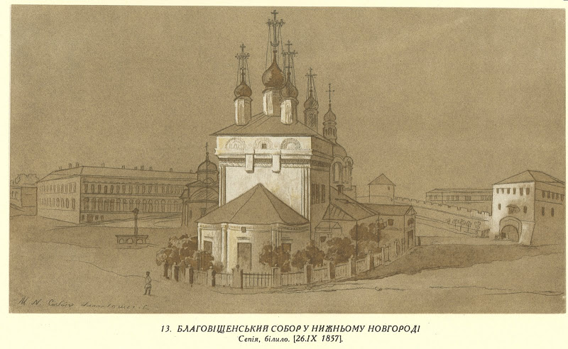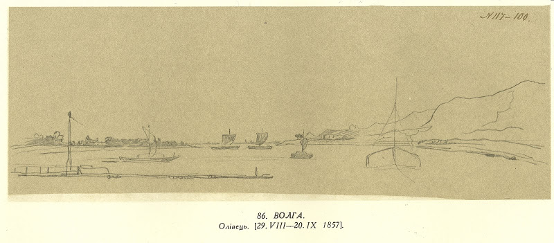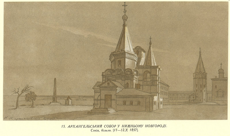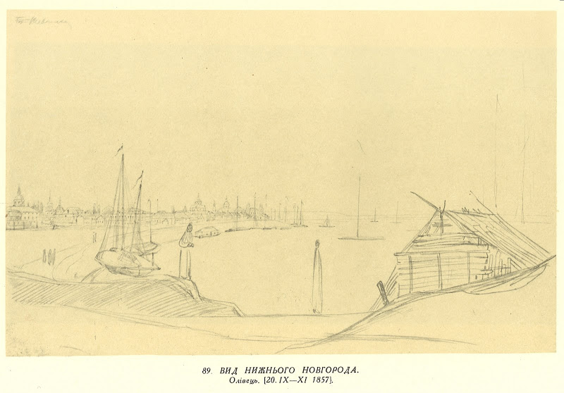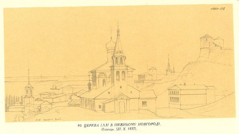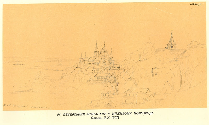 | Портрет Тараса Григорьевича Шевченко и неизвестного. Памятник тысячелетия России в Нижнем Новгороде. Наброски. | Бумага, карандаш, тушь, перо | 27,2×21,4 | 12 декабря 1859 |