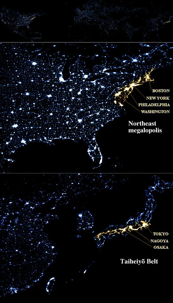 - японский мегалополис Тайхэйё складывается из смежных агломераций: агломерации городов Токио и Иокогамы (которая к 2026 году опустилась на 3-е место в мире с населением 33,4–37,3 млн жит.)[1], агломерации города Нагоя и агломерации городов Осака — Кобе — Киото;