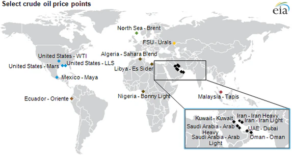 К трем наиболее котируемым нефтепродуктам относятся добываемая в Северной Америке, на западе Техаса нефть West Texas Intermediate (WTI), североморская нефть марки Brent и нефть ОАЭ марки Dubai, и их цены используются в качестве ориентира для всей нефтяной промышленности, хотя в целом имеется 46 других основных стран - экспортеров нефти. Цена на нефть Brent, как правило, превышает спотовую цену на WTI, которая обычно на 5-10 долларов выше, чем стоимость корзины ОПЕК. WTI и Brent указаны в ценах FOB с мест поставок, а не с мест добычи. Для WTI точка доставки - Кушинг (Оклахома); для Brent это Саллом Во, расположенный в Шетланде, островном архипелаге к северу от материковой Шотландии.