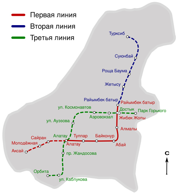 По генеральному плану развития города, в Алматинском метрополитене планируется построить 24 станции, 11 из которых по состоянию на 2023 год находятся в эксплуатации.