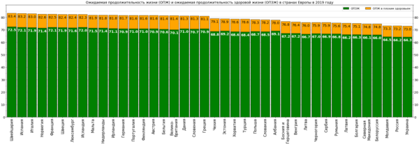 Средняя продолжительность жизни в России на 2018 год составляет около 73 лет и сильно различается от региона к региону, разница составляет 19 лет, самая высокая ожидаемая продолжительность жизни в Республике Ингушетия — 82,41, самая низкая в Чукотском автономном округе — 63,58[8].
