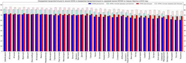 Ожидаемая продолжительность жизни при рождении в 2019 году согласно данным Группы Всемирного банка[1][2][3]. На общий список наложен фильтр согласно списку государств Европы. В списке Группы Всемирного банка отсутствуют мини-государства с численностью несколько десятков тысяч человек (Андорра, Ватикан, Монако, Сан-Марино). Значения в таблицах Группы Всемирного банка округлённые. Все вычисления проведены на неокруглённых данных, поэтому, вследствие нюансов округления, в некоторых местах возникли кажущиеся нестыковки индикаторов, размером в 0,01 год.